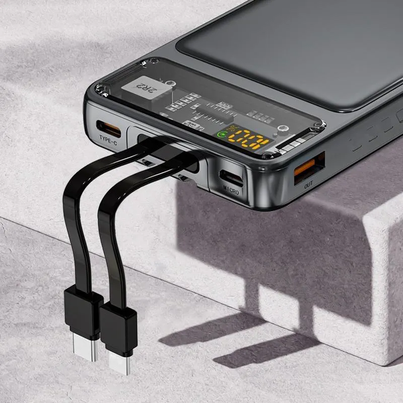 متصل جهت شارژ کردن گوشی های مختلف اشاره نمود. علاوه بر این دارای یک درگاه خروجی USB، یک درگاه Micro USB و یک درگاه Type C نیز می باشد. این پاوربانک طراحی زیبایی دارد و میزان شارژ را به صورت درصد در نشانگر LED نمایش می دهد.