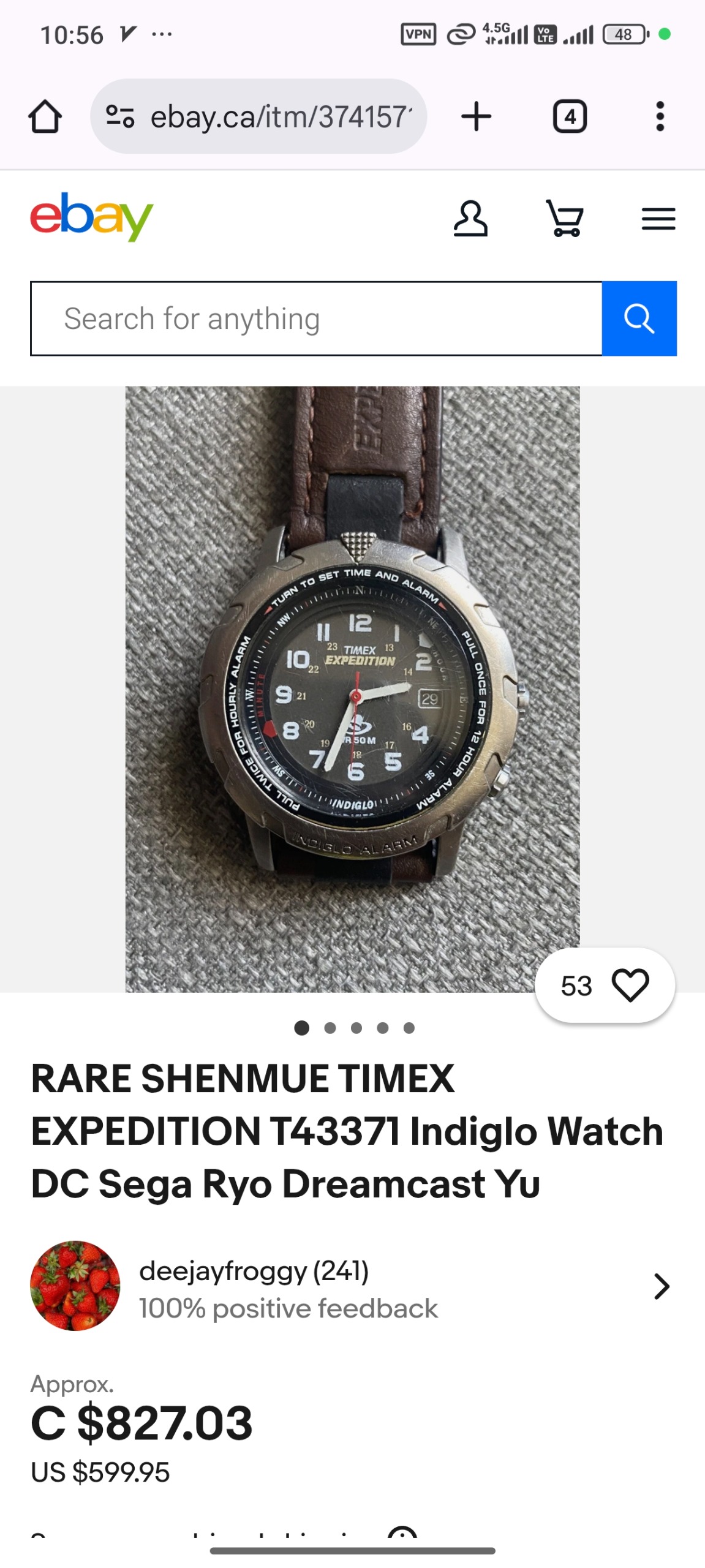 RARE SHENMUE TIMEX EXPEDITION T43371 Indiglo Watch DC Sega Ryo Dreamcast Yu