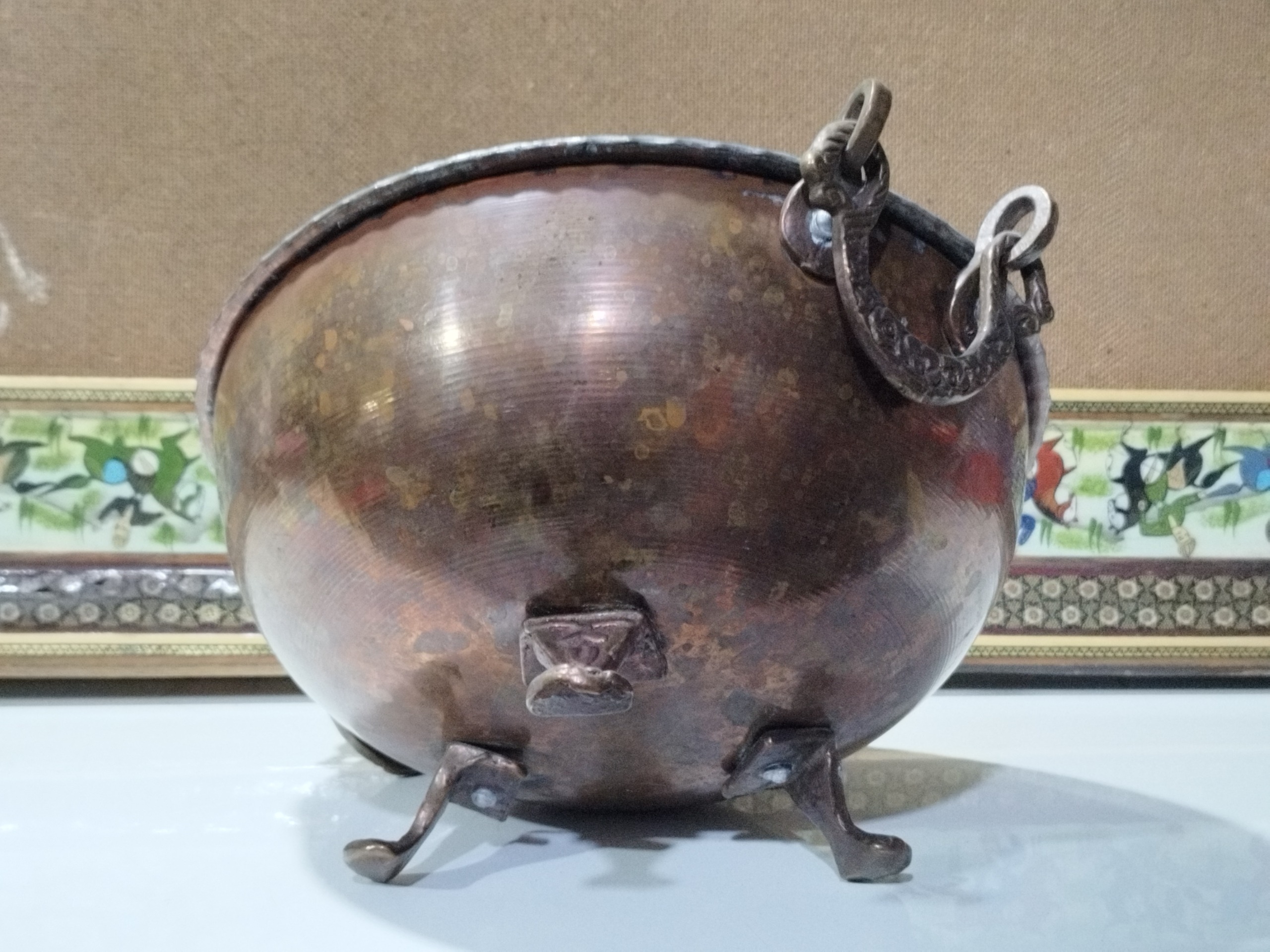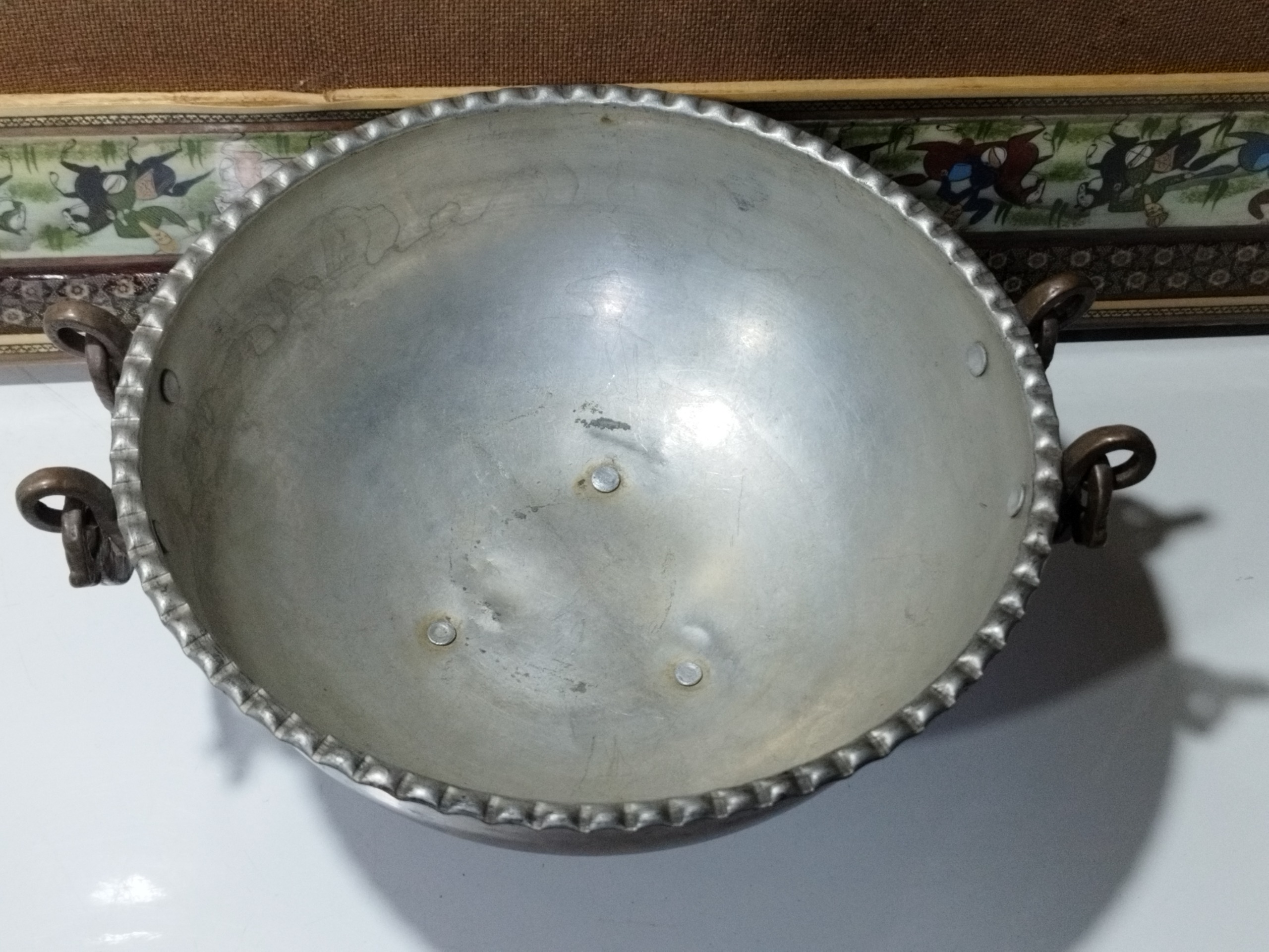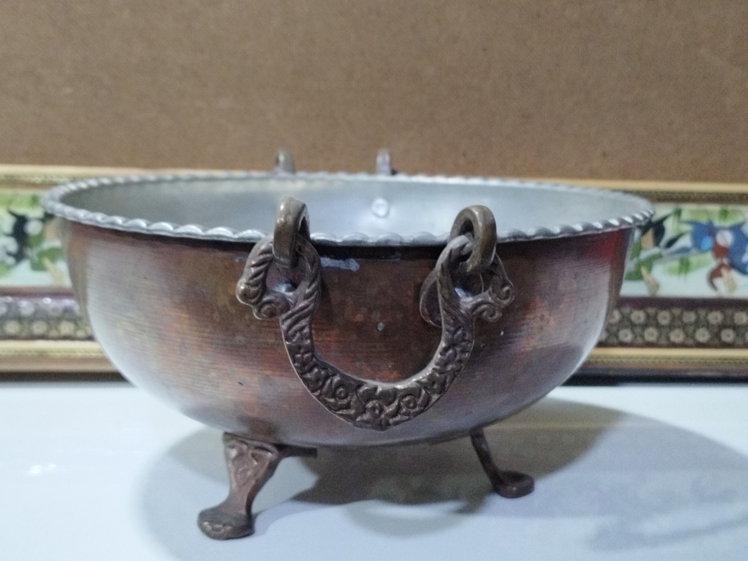 میوه خوری مسی قدیمی پایه هاچرخشی و دسته ها مسی قلمزنی شده