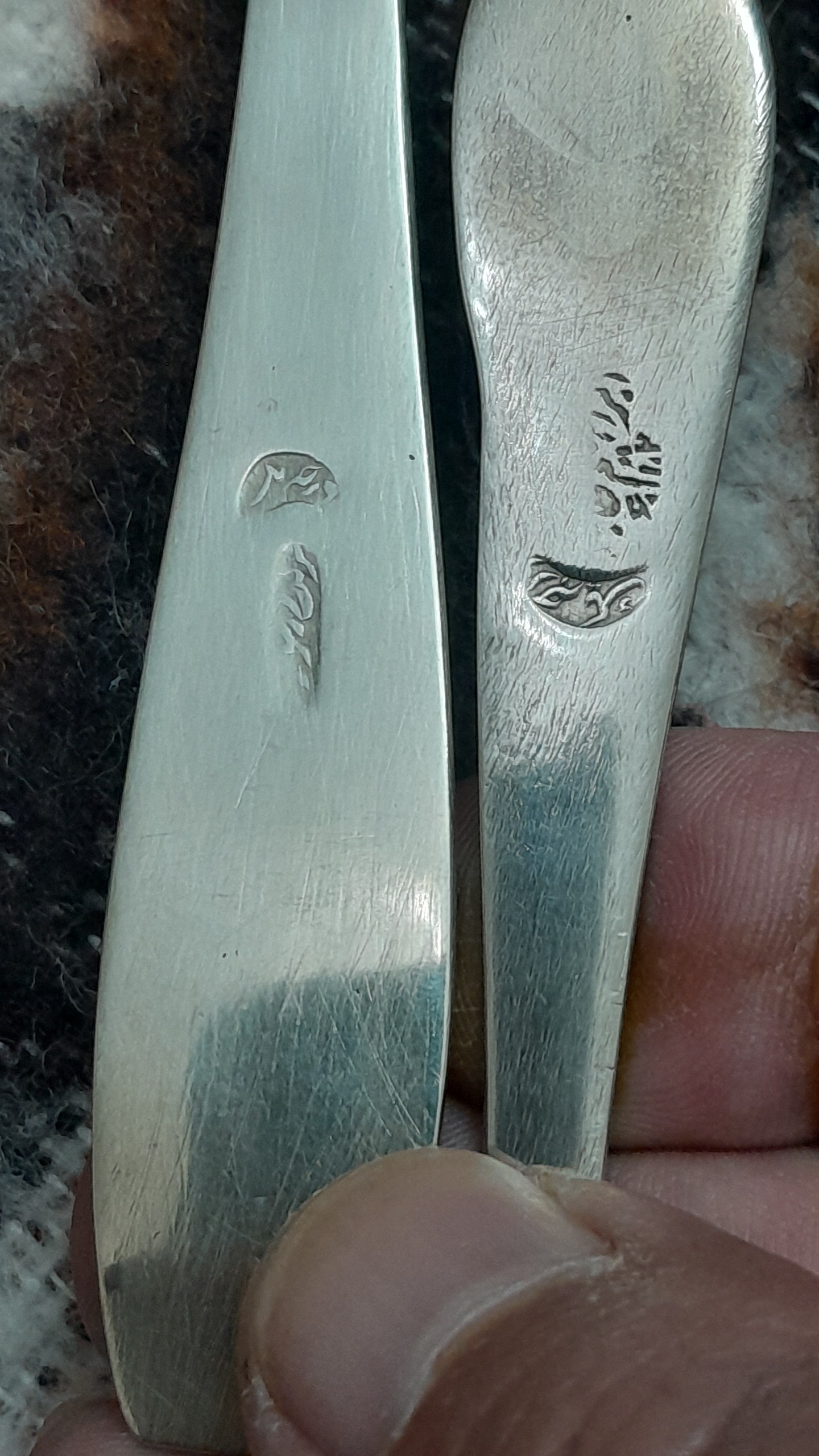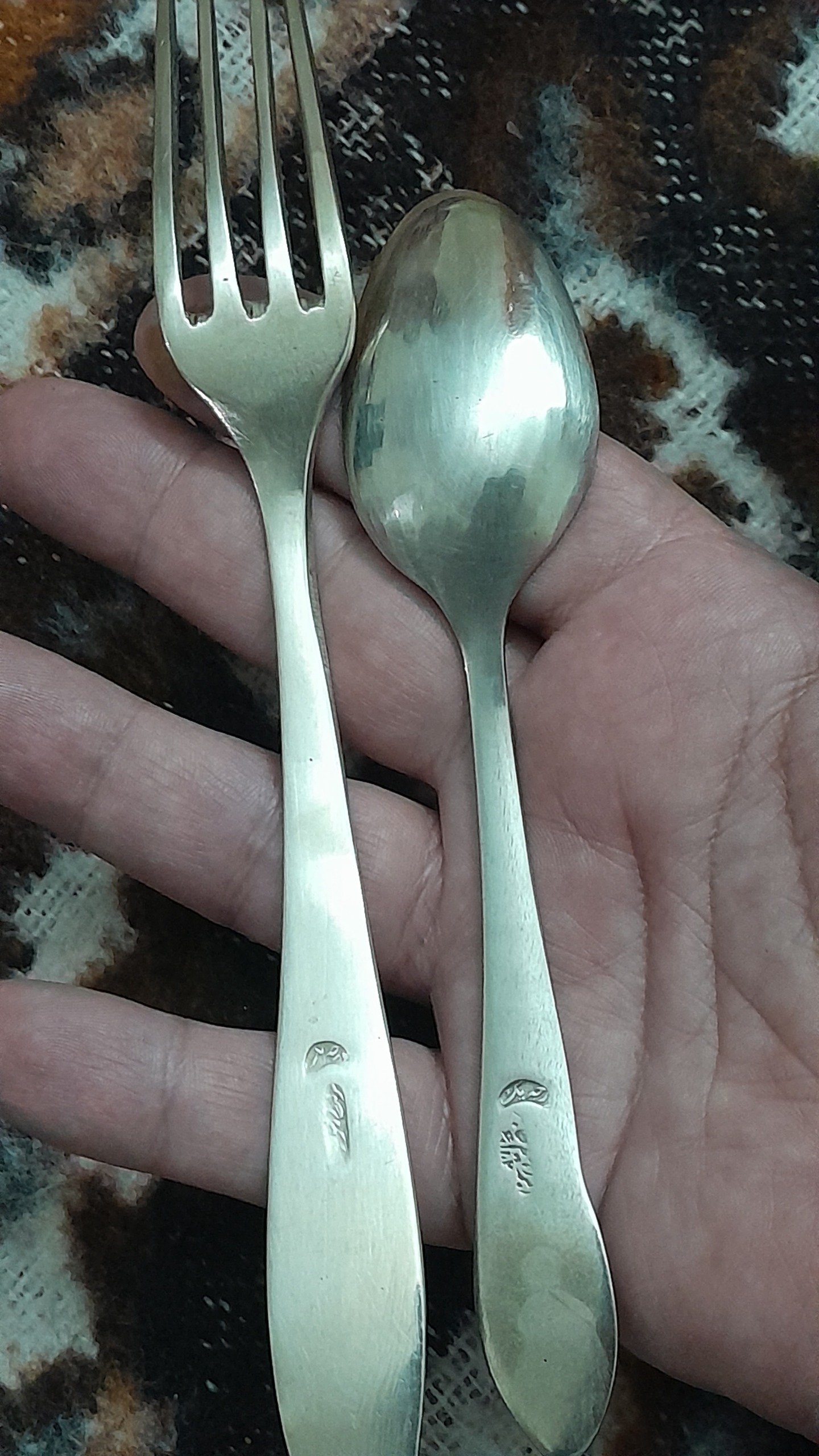 یک عدد قاشق چایخوری ویک چنگال قدیمی دست ساز هستن وخیلی کهنه هستن جنسشونو نمیدونم چیه جفتش 350