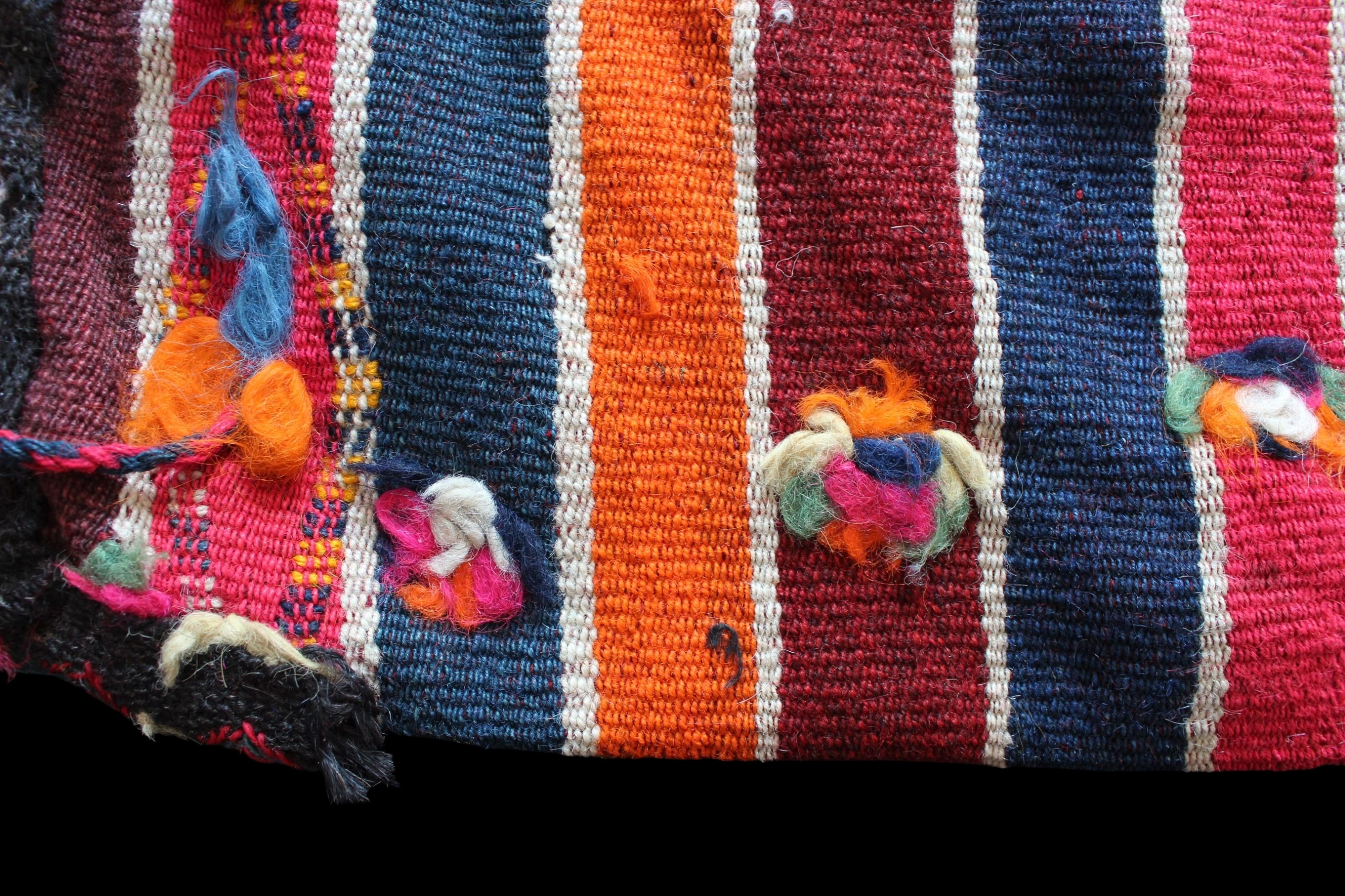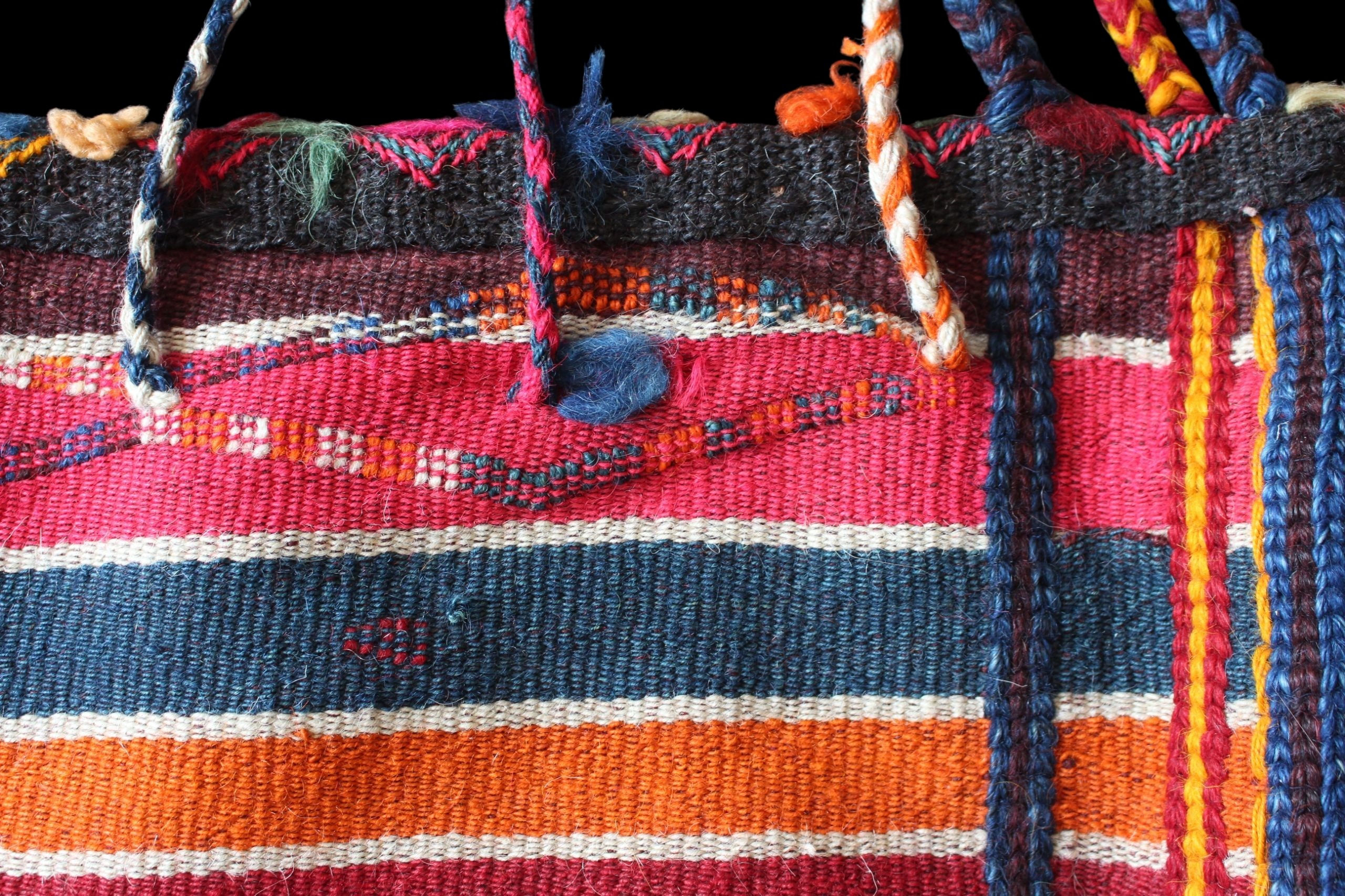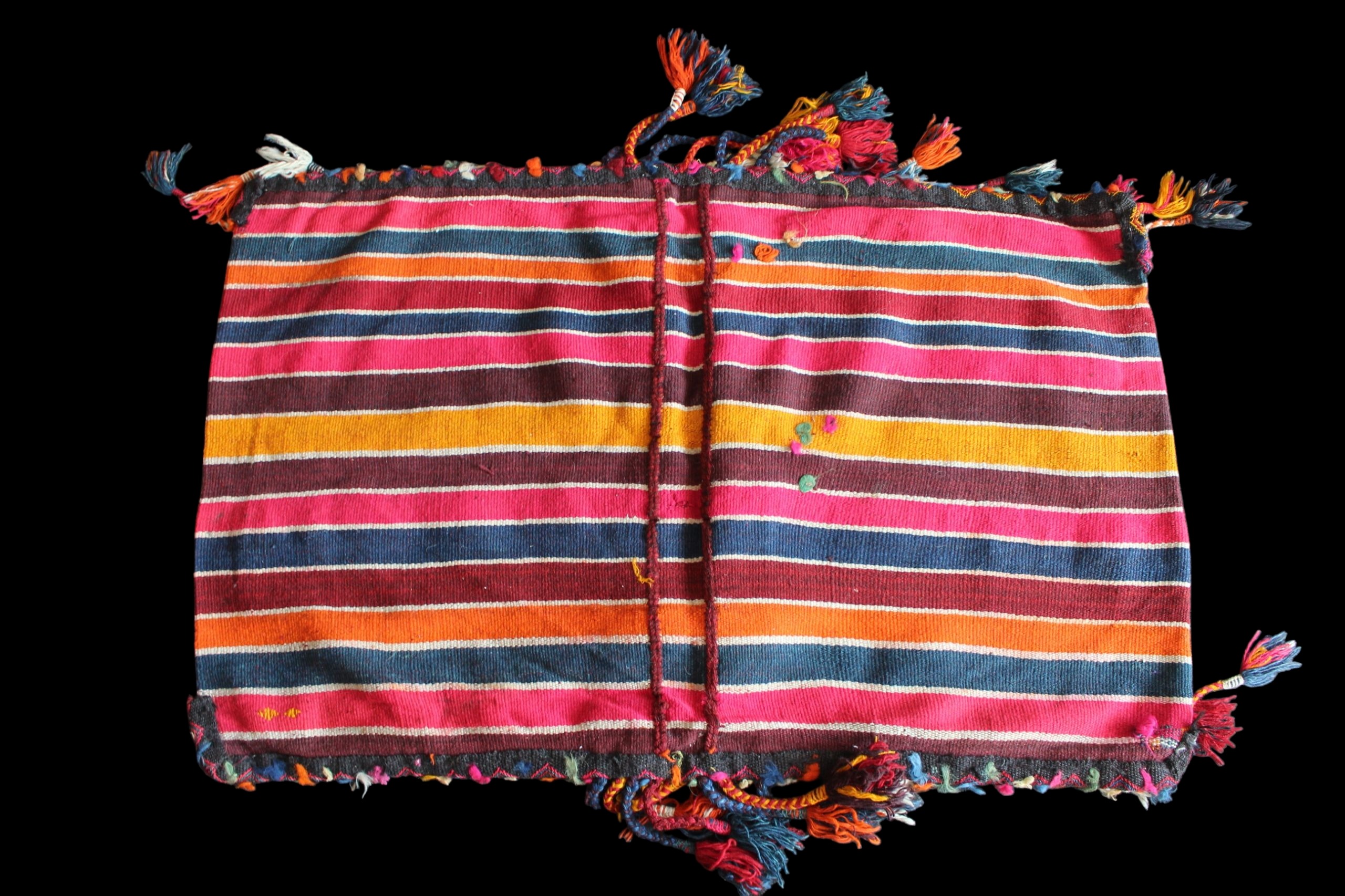 این خورجین اصیل قشقایی بافتهای است پر از رنگ، نماد و کاربرد. نوارهای افقی رنگارنگ در طیف سرخ، آبی، زرد و نارنجی بافته شدهاند که بیانگر شادی، زندگی و حرکت در فرهنگ عشایر است.