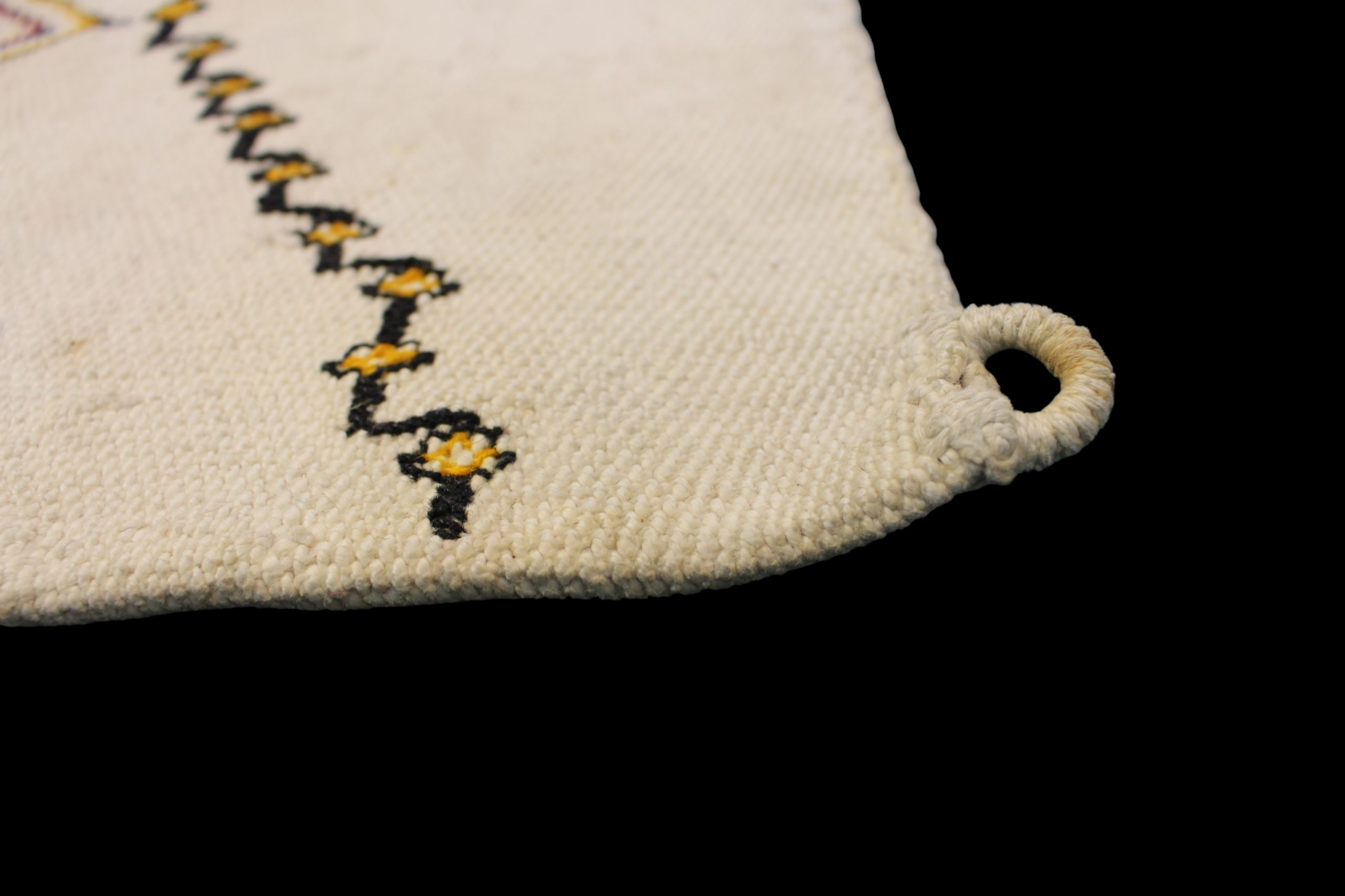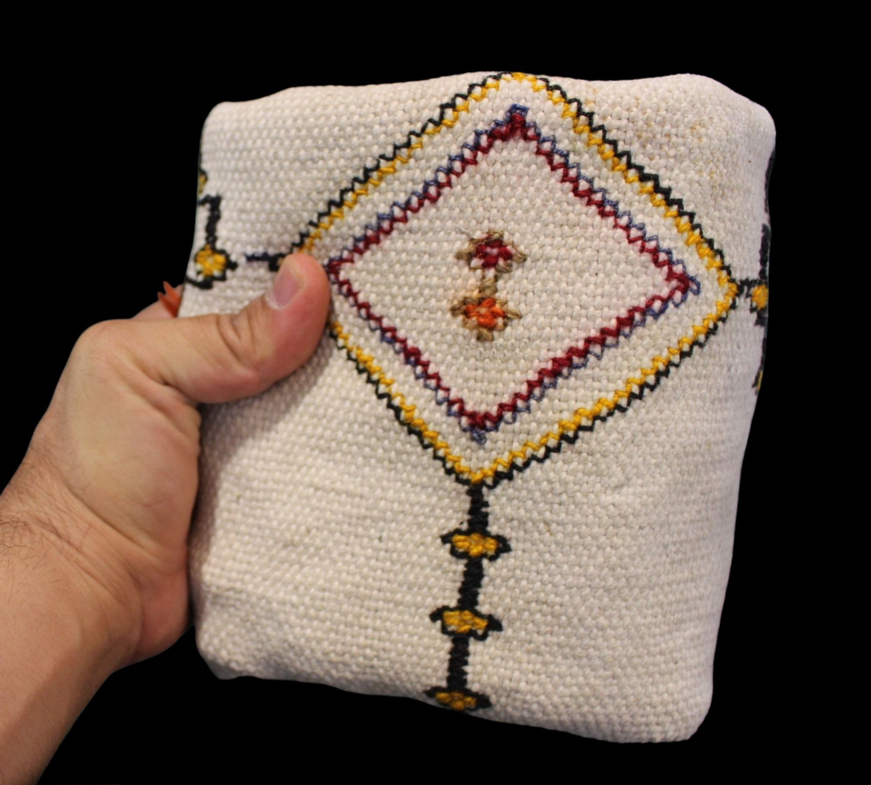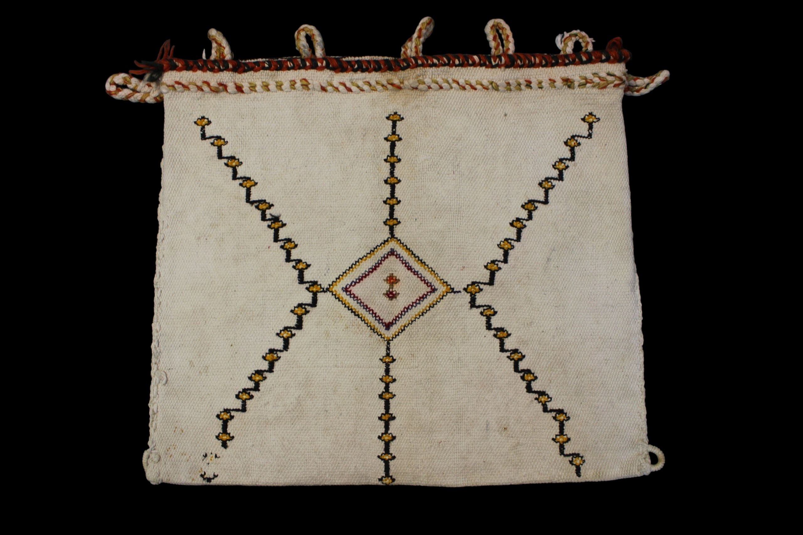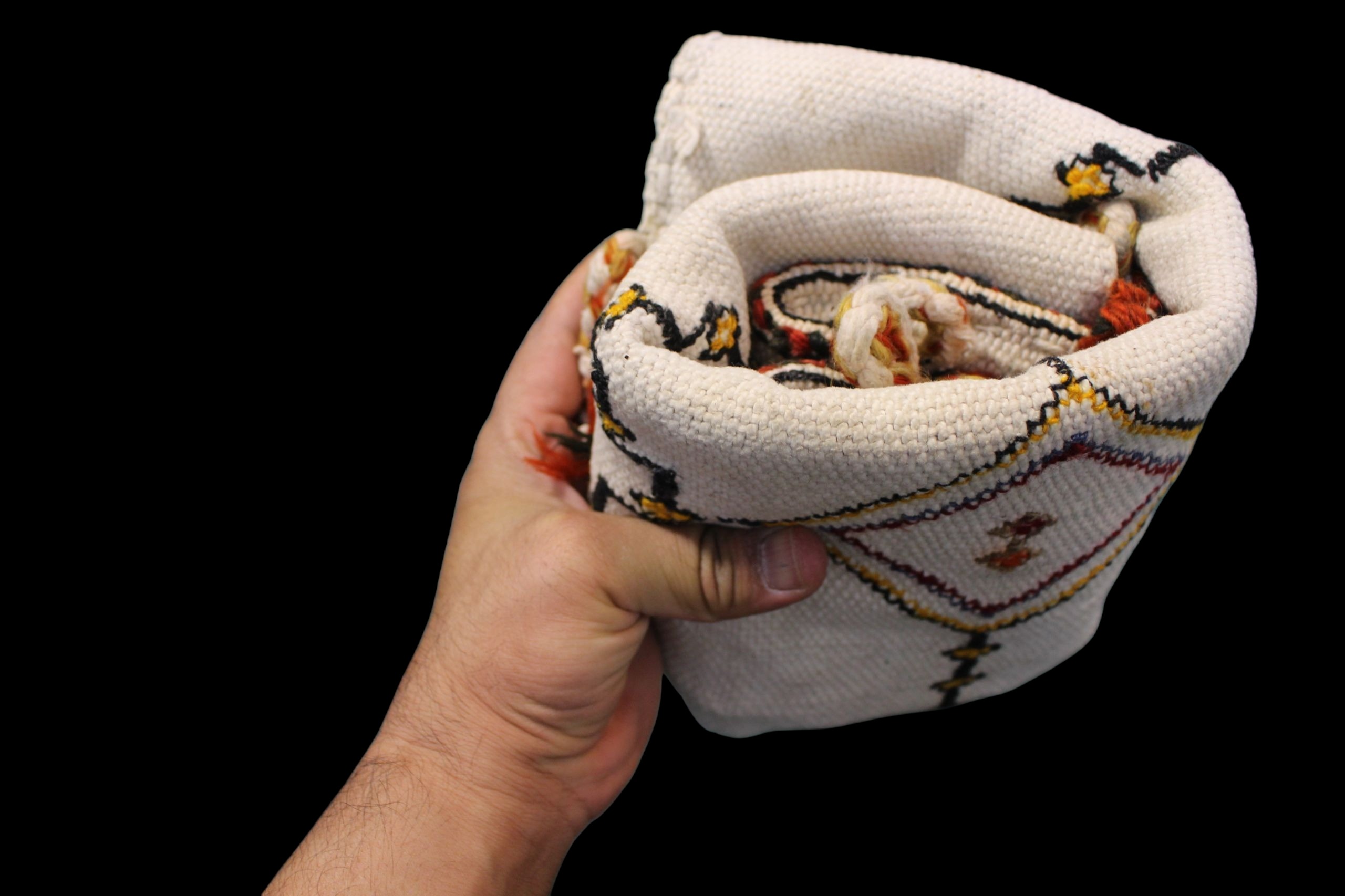 این توبره بافتهی دست زنان بختیاری است که در آن کاربرد و زیبایی در کنار هم قرار گرفتهاند. زمینهی روشن و ساده، بستری برای نقوش ریز و منظم رنگی است که با نخهای زرد، قرمز، مشکی، آبی و سبز بهصورت زیگزاگ و نقطهای بافته شدهاند.