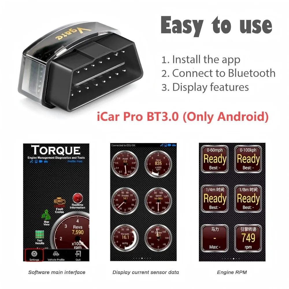 با بسیاری از برنامههای محبوب OBD2 کار میکند - دستگاه Vgate iCar Pro Bluetooth3.0 با اکثر برنامههای محبوب OBD کار میکند. لطفاً دستورالعمل دانلود برای دستگاه اندروید را در توضیحات محصول بیابید.