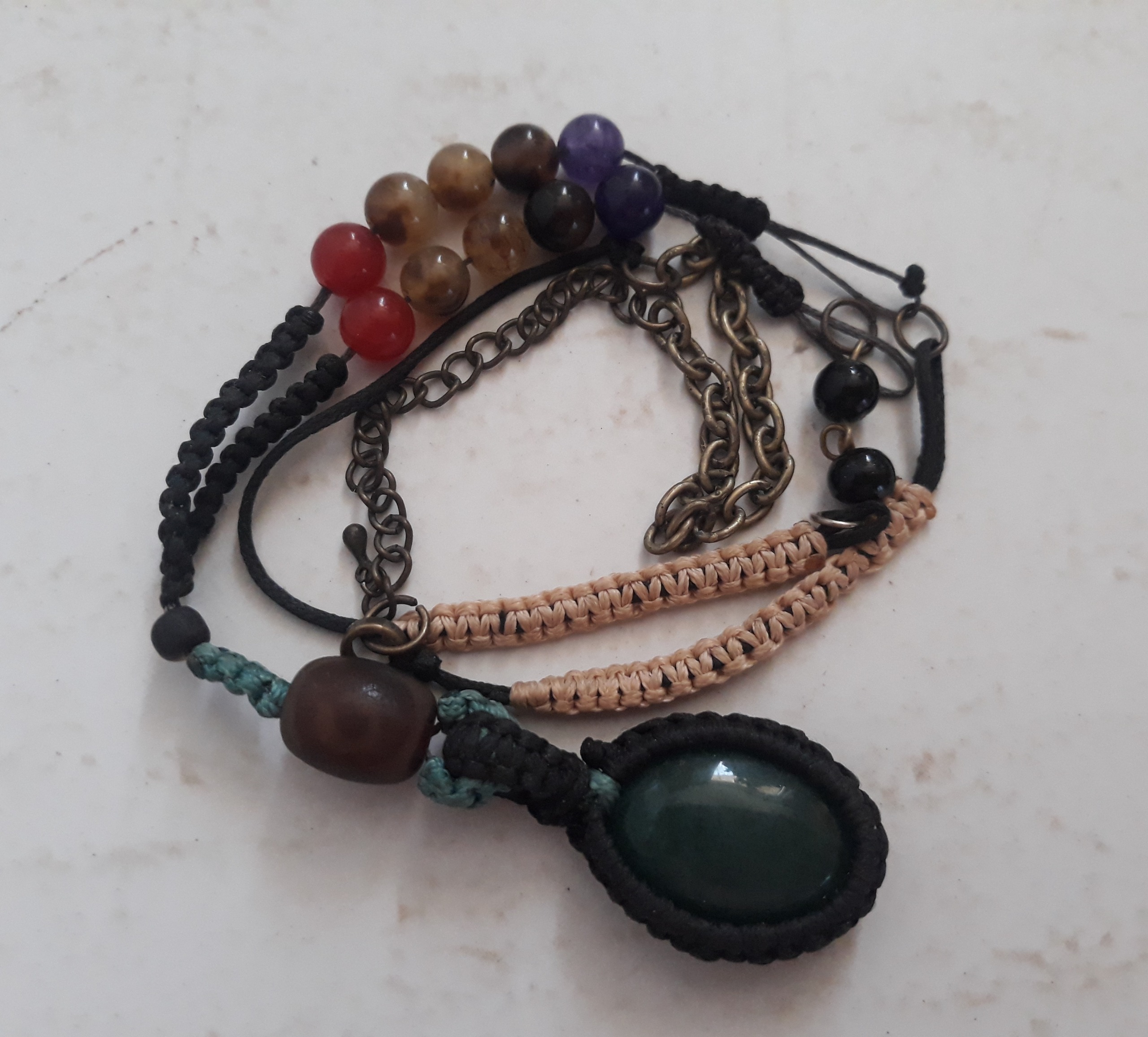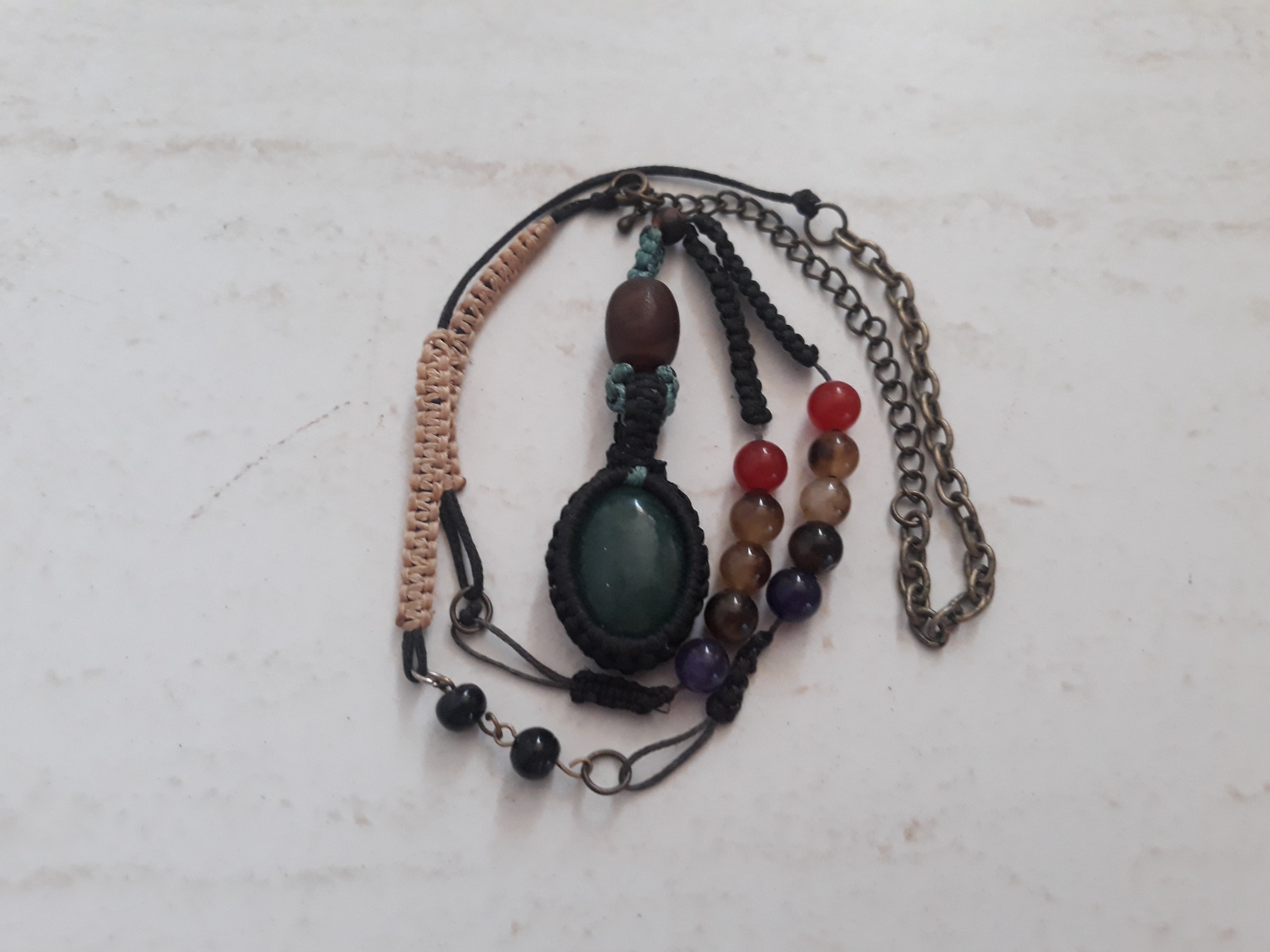 گردن آویز یشم(یشم آویز اصلی گردنبند است و مابقی سنگ های نیمه قیمتی متفاوت) ، زیر یشم عقیق و تعدادی دیگر سنگ های معدنی همخوان برابر با تصویر . لطفا تاثیرات سنگ ها بر زندگی اشخاص برابر با ماه و سال تولد که کاملا علمی می باشد را مطالعه بفرمایید
