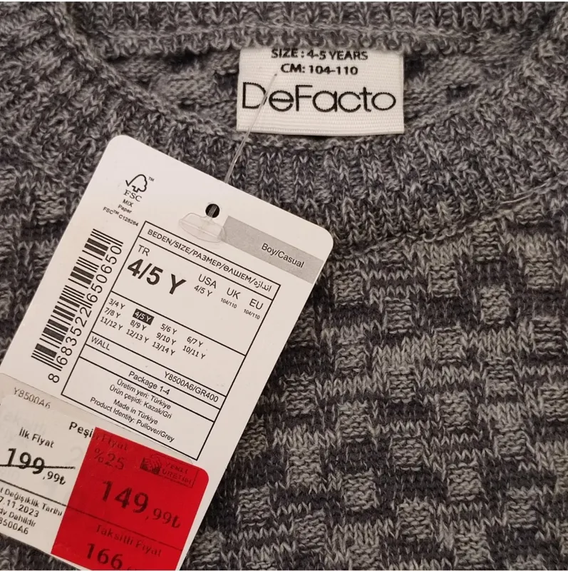 بافت پسرانه طوسی برند Defacto, وارداتی از ترکیه