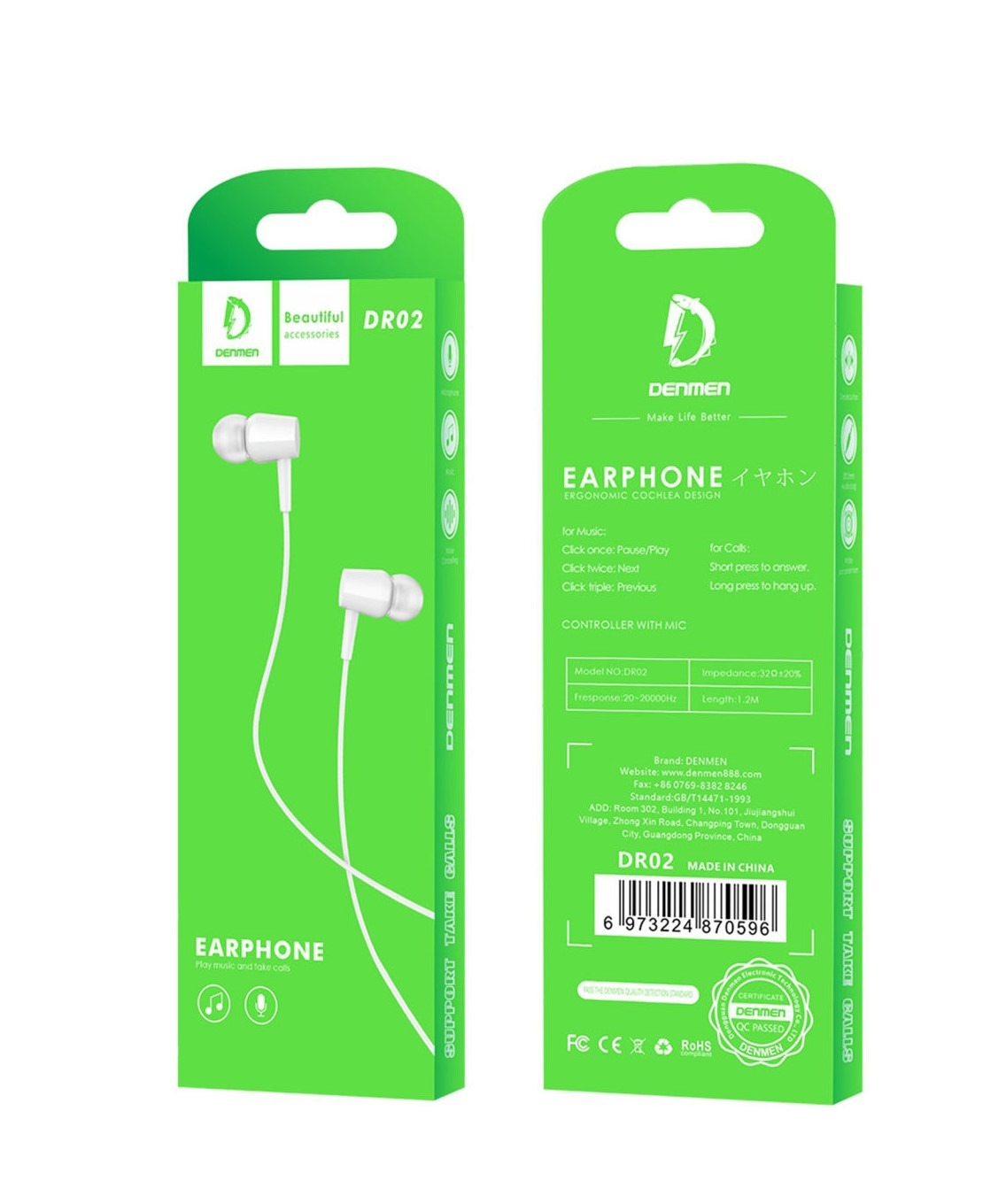 هندزفری «DR02» محصولی از شرکت «دنمن» است که از طریق جک 3.5 میلیمتری صدا به تلفنهمراه متصل میشود. این هندزفری طراحی بسیار سادهای دارد ولی صدای تولیدی آن بسیار با کیفیت است. هنگام گوش کردن به موسیقی توسط هندزفری دنمن مدل «DR02» شاهد بیس بسیار