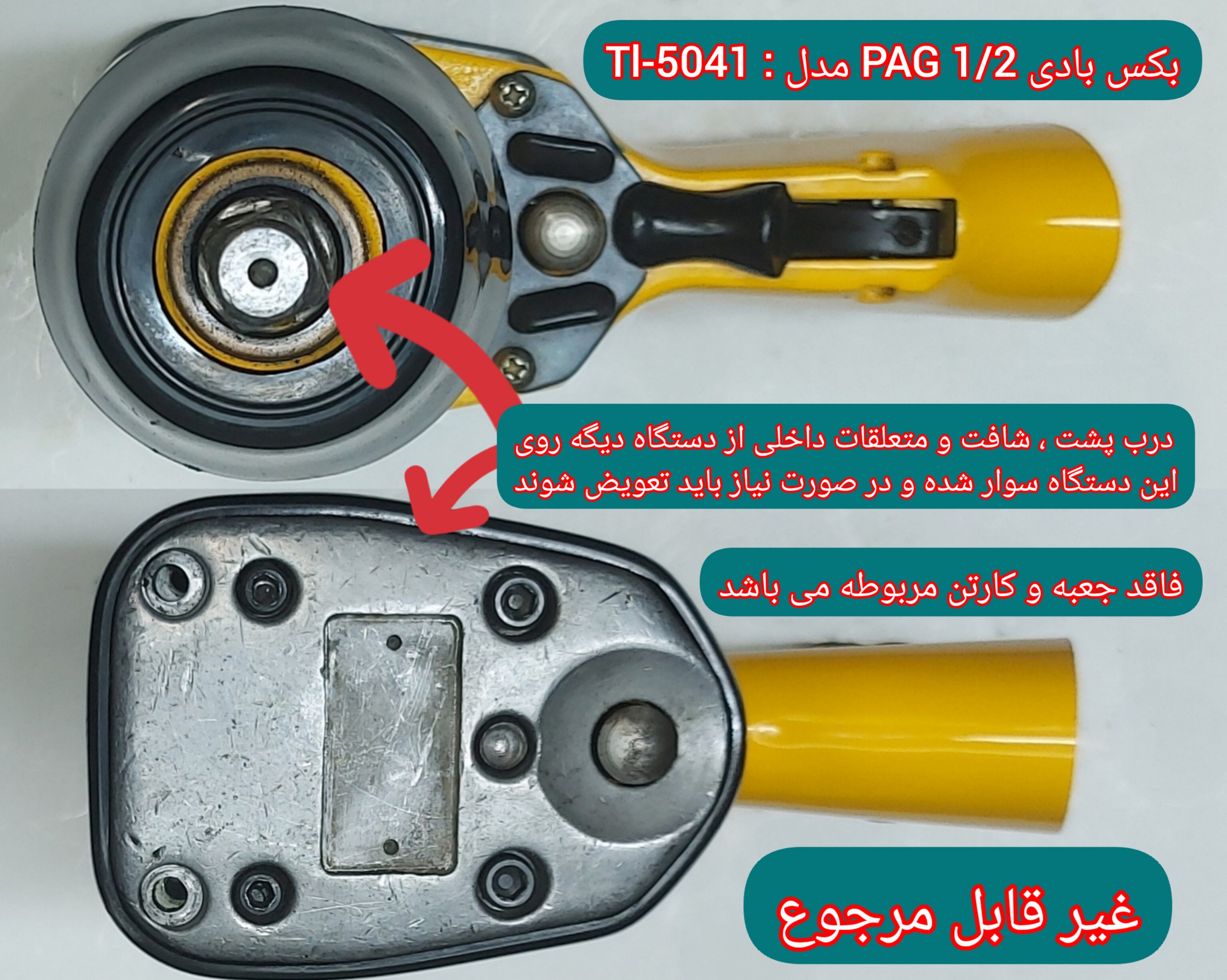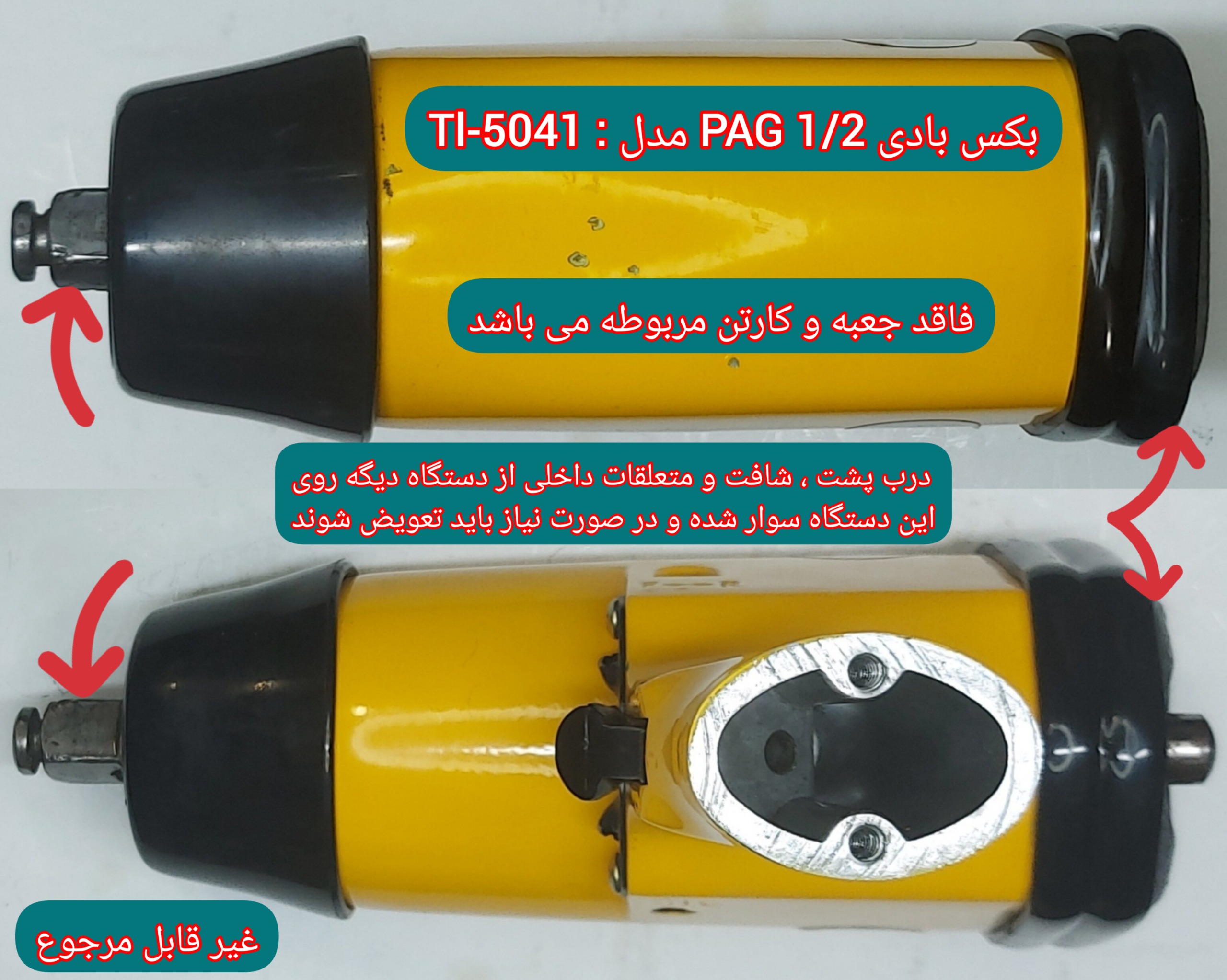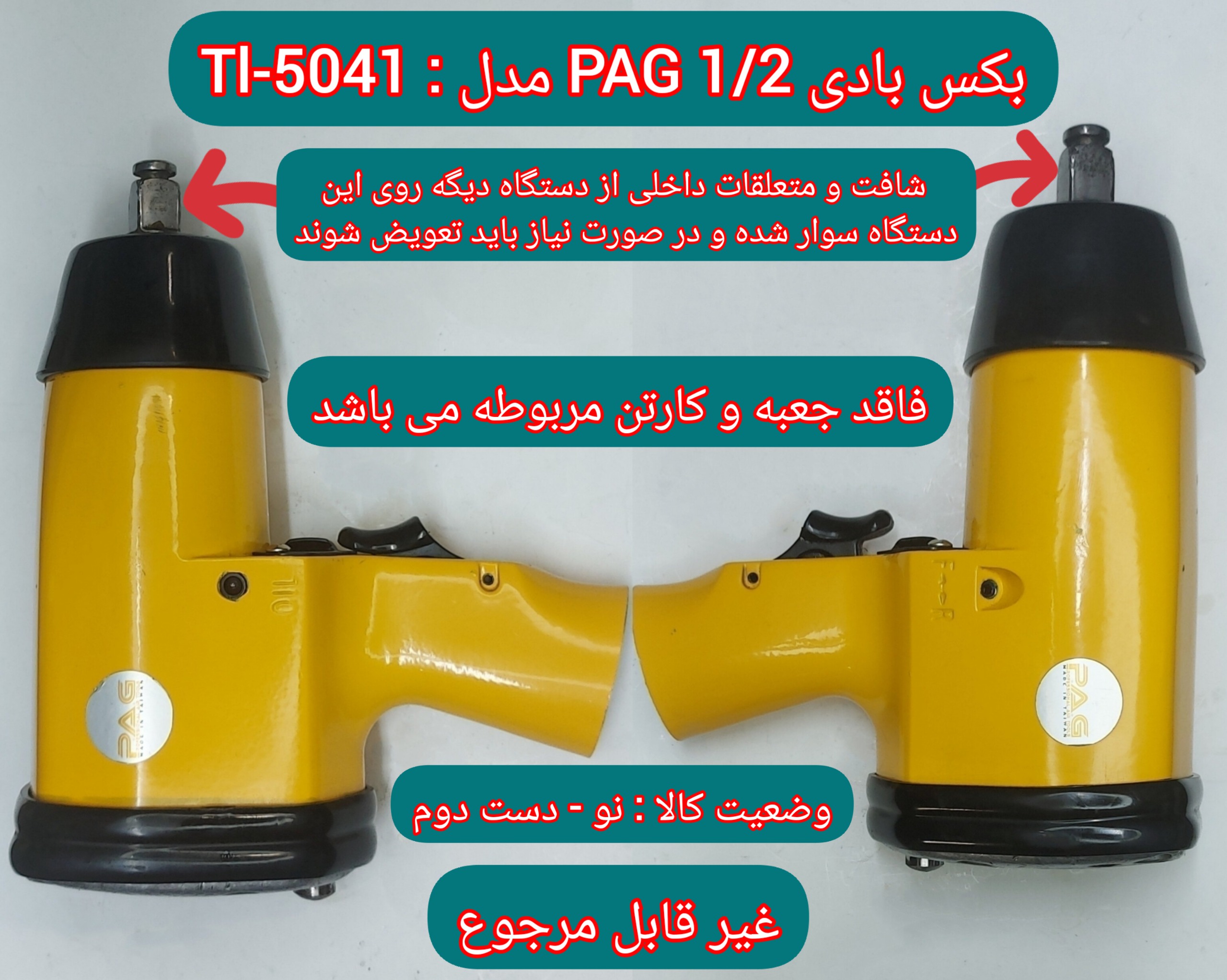 بکس بادی PAG مدل : TI-5041 بازه سرعت : 5000 الی 10000 دور در دقیقه فشار مناسب باد : 6.3 بار (90 psl) سرعت آزاد : 7000 دور در دقیقه وزن : 2.247 کیلوگرم گشتاور : N.M 320 درایو : 1/2 اینچ قابل توجه خریداران گرامی شافت و متعلقات داخلی از دستگاه دیگه روی این دستگاه سوار شده و باید تعویض شود در ضمن مبلغ درج شده با احتساب کارمزد 1 میلیون تومانی ایسام و مبلغ پستی 100 هزار تومانی که داخل ایسام درج شده هستش که این مبلغ پستی درج شده داخل ایسام