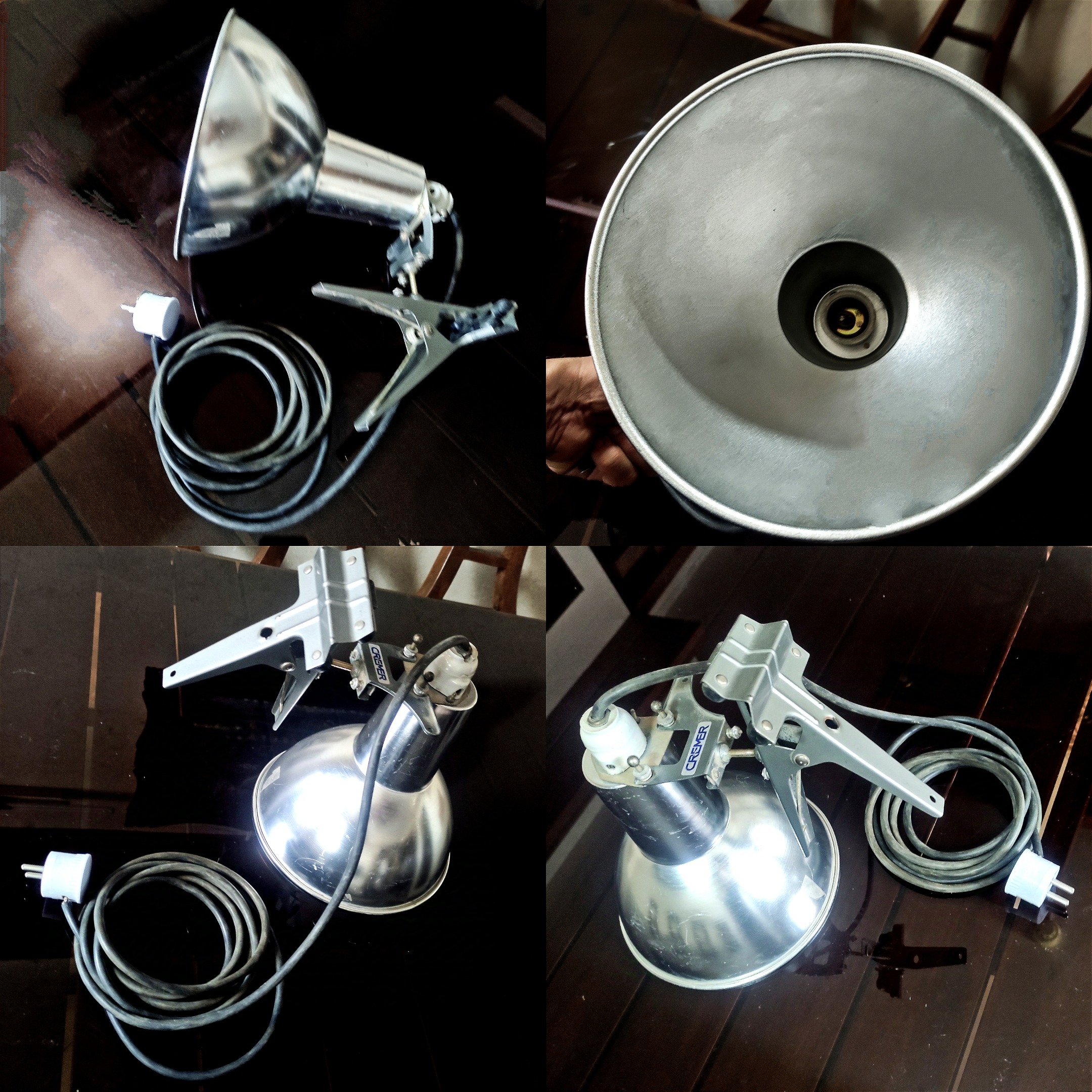 گیره لامپ نقطه ای ، پروژکور کرمر CREMER برند فرانسوی، کاسه آلومینیومی کرومی بزرگ و قابلیت نصب گیره روی تمام پایه های میله ای ، تخت و یا لبه میز و صندلی و لبه کناف سف ... قابل تنظیم در بسیاری از موقعیت ها توسط 2 مفصل توپی. این نوع پروژکتور نقطه ای اغلب برای سینما، تئاتر یا عکاسی بسیار استفاده می شده است . در داخل حباب کروم آن قابلیت نصب لامپ از 10-15 وات تا 1000 وات پیش بینی شده است - این کالا قبلاً مورد استفاده قرار گرفته است و البته بسیار تمیز و در حد نو ارائه میشود طول کابل آن 3 متر و دهانه حباب فلزی 22٫5 سانتیمتر میباشد