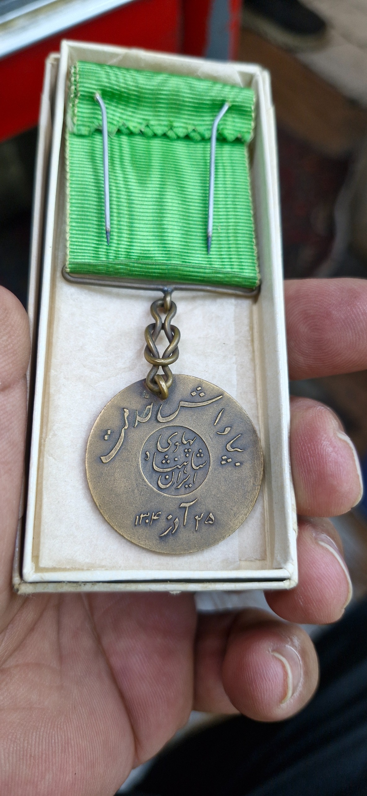 مدال برنز بپاداش خدمت رضا پهلوی 25آذر 1304 همراه با رویان وجعبه فابریک اصیل کیفیت عالی مطابق با تصاویر