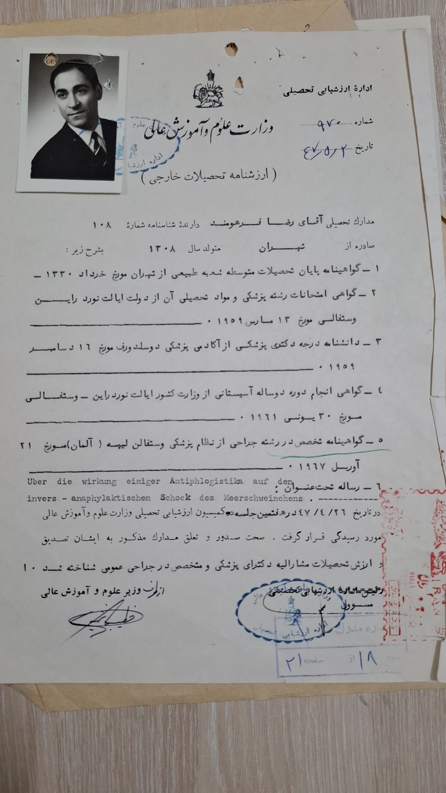 ارزشنامه تحصیلات خارجی مربوط به آقای رضا فرهومند وزارت علوم و آموزش عالی اداره ارزشیابی تحصیلی سال 1347(3برگ)
