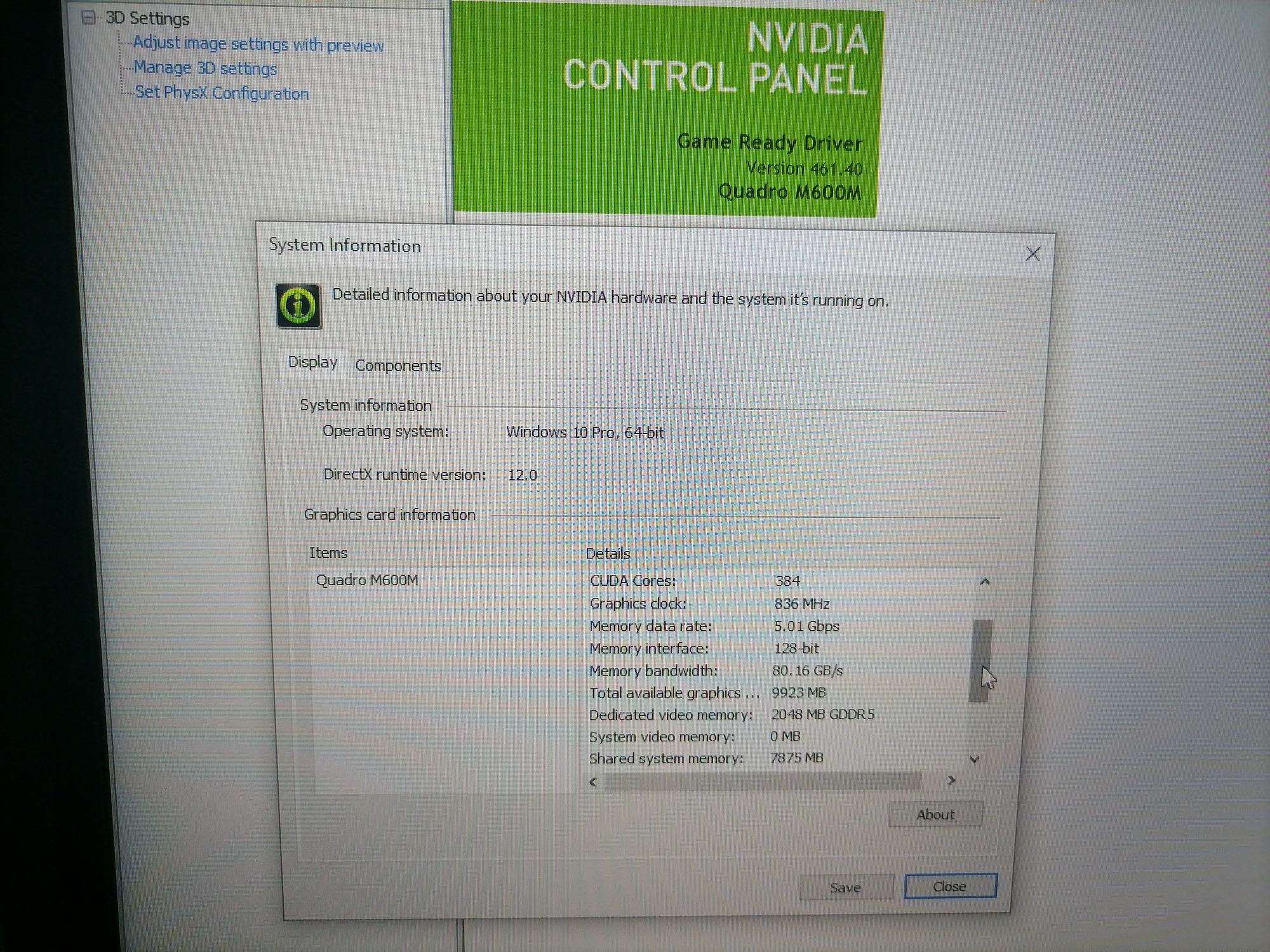 VGA : intel HD 520 + 2G QUADRO M600M DDR5 128 bit up 10G