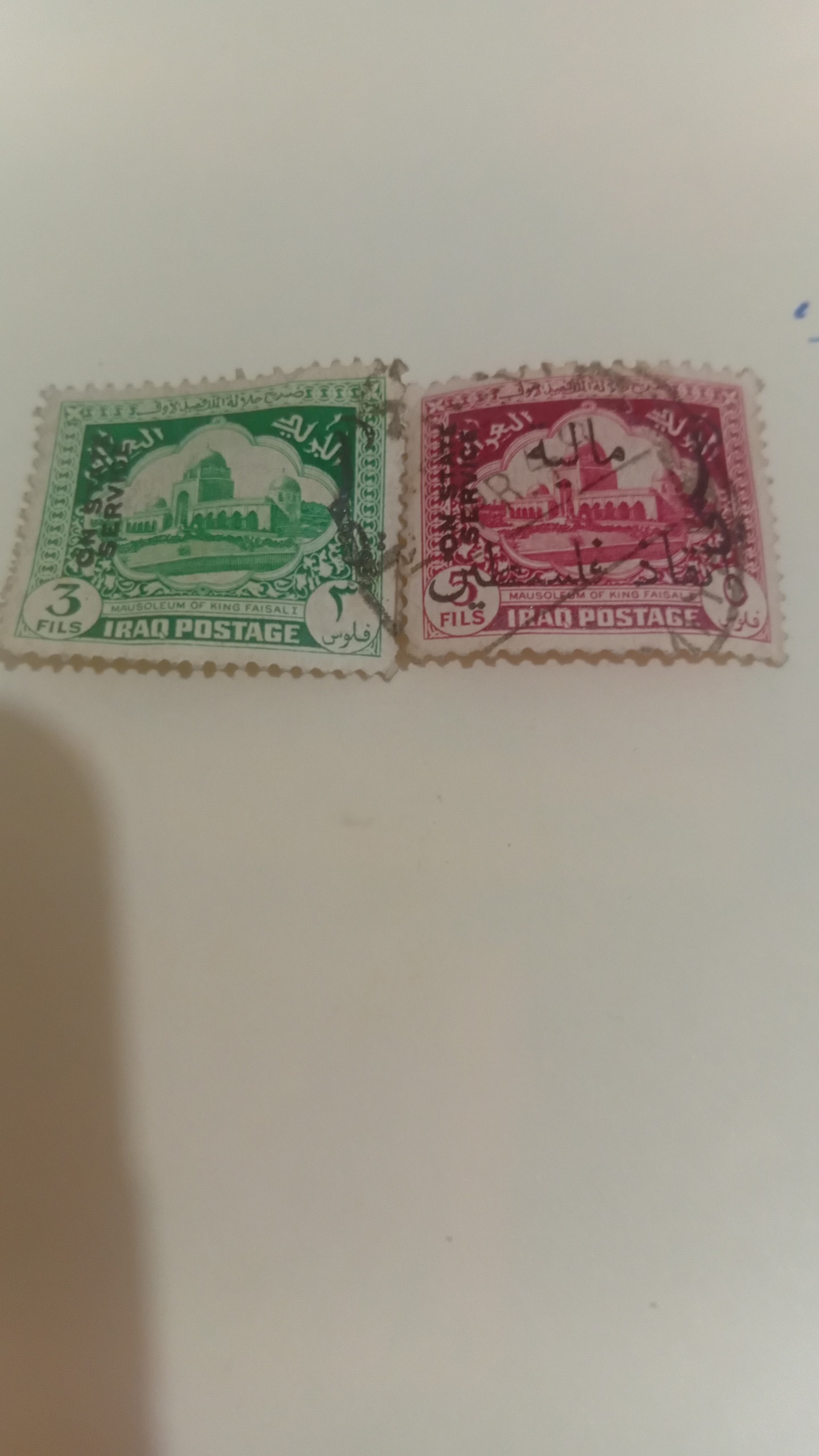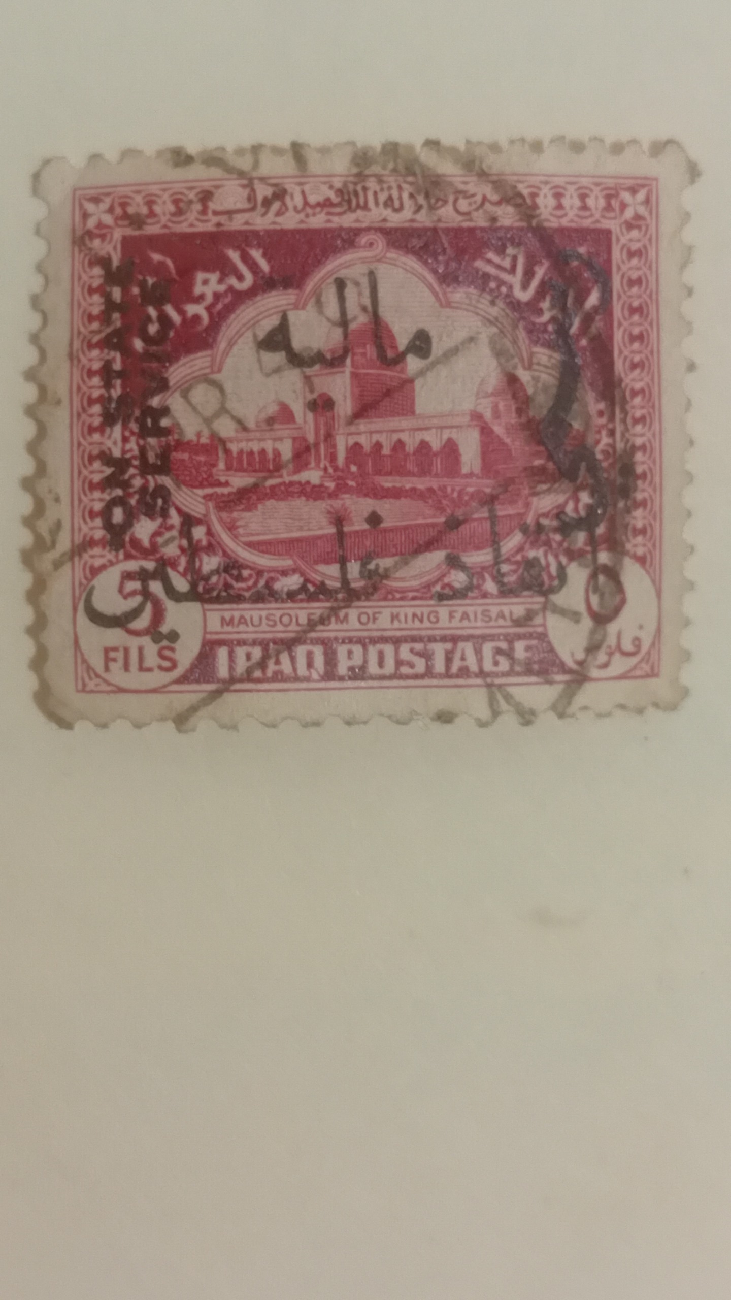 تمبر پستی عراق که سورشارژ رسمی (سرویس) شده و یکبار هم تبدیل به تمبر مالیه گردیده،و در پایان هم به کشور تازه تاسیس فلسطین تعلق یافته.