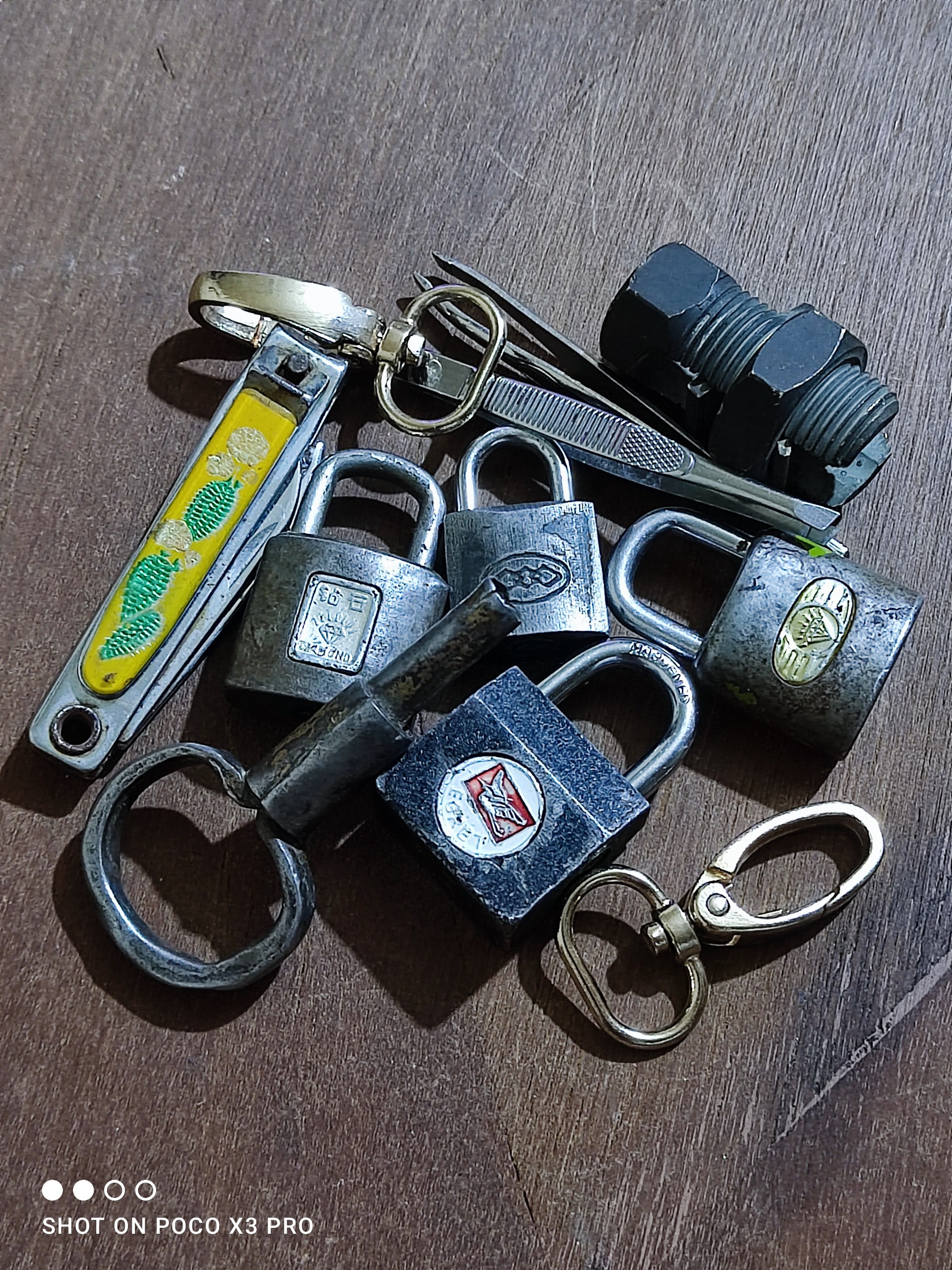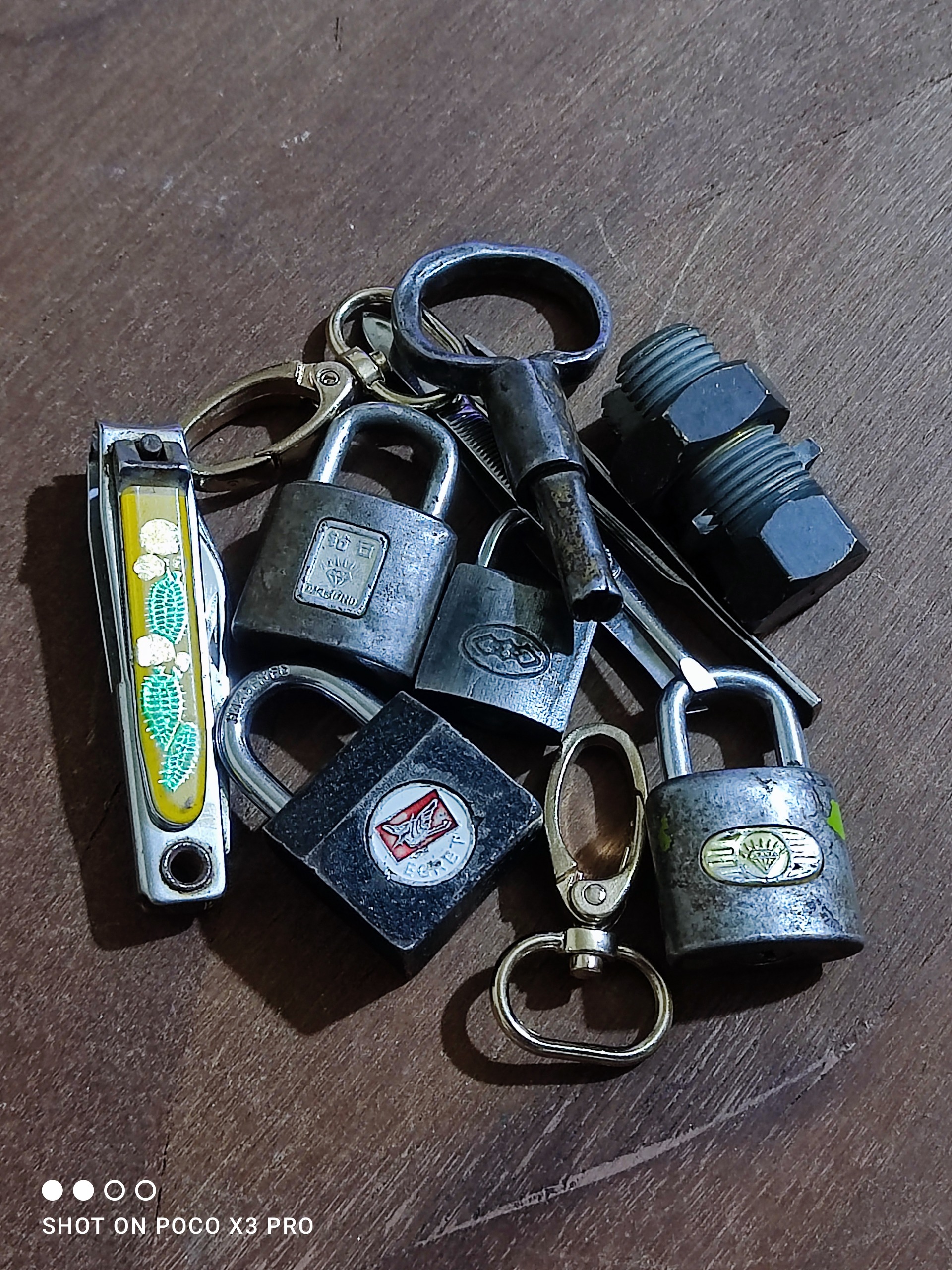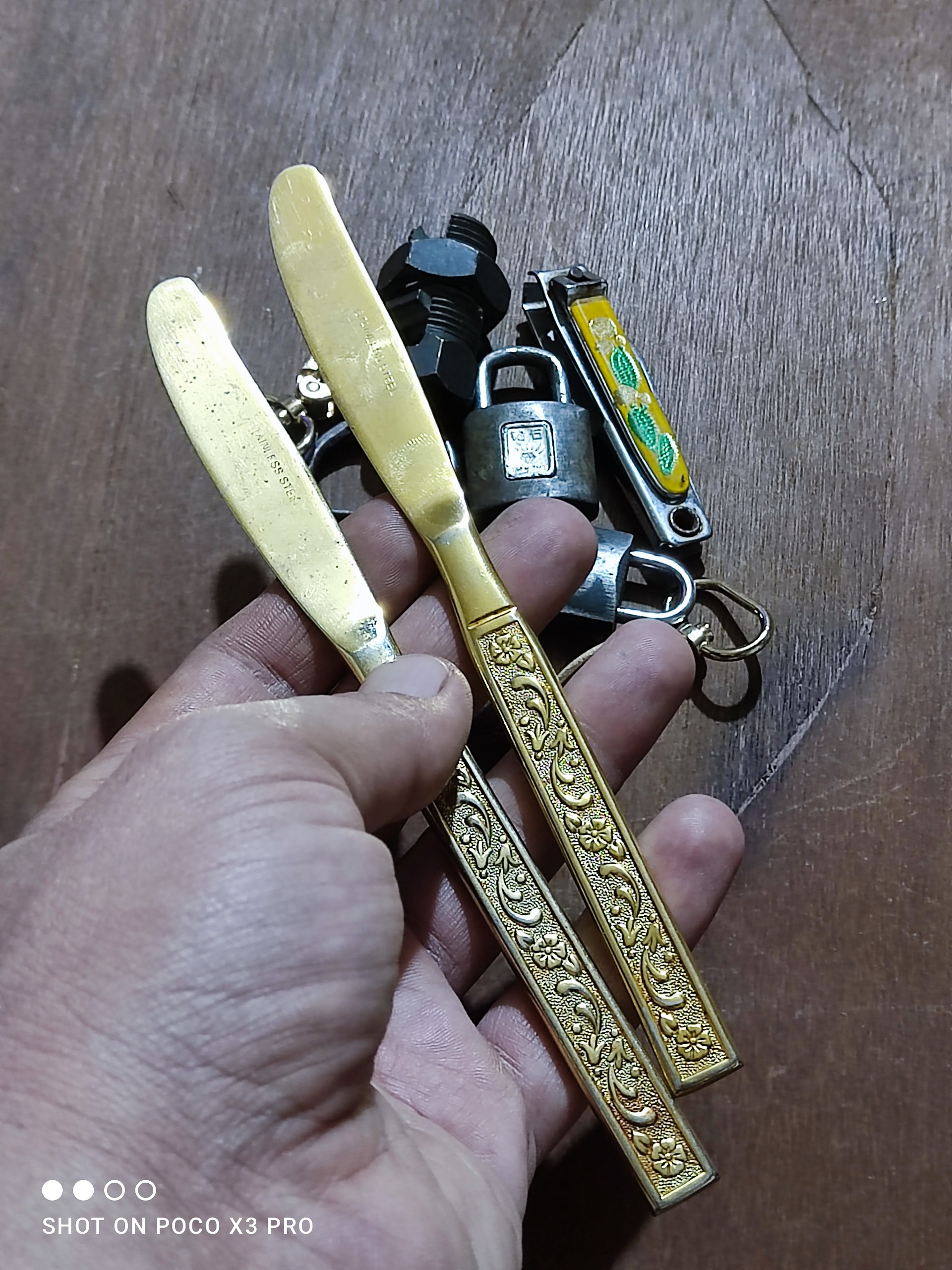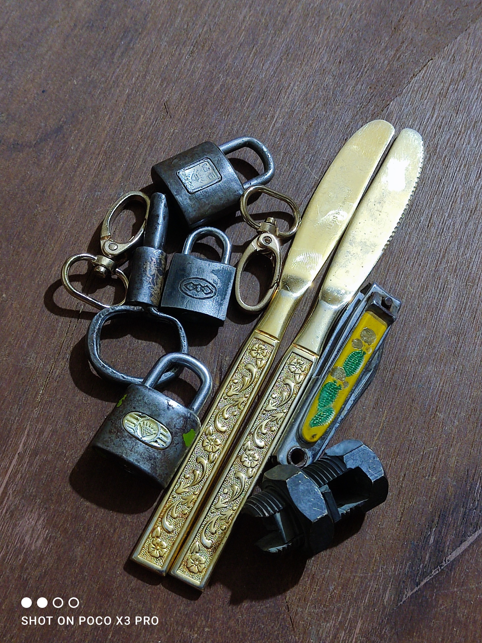خورده ریز قدیمی دوتا چاقوی کره خوری طلایی ناخنگیر قدیمی چاقو و سربازکن هم داره سه تا قفل قدیمی کوچک فاقد کلید یدونه کلید فولادی دستساز مربوط به قفل لوله ای قاجاری و غیره قیمت برای همشه مطالق تصاویر