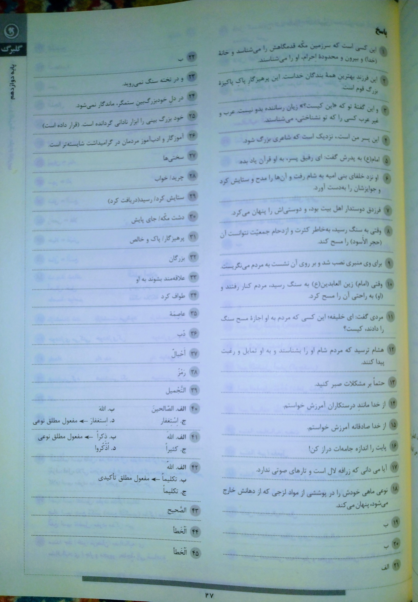 این کتاب در هر درس شامل نمونه سوال و پاسخ همچنین فلش کارت های درس نامه دار دارد که به شدت برای شب امتحان مفید است همچنین در پایان 4 آزمون دارد