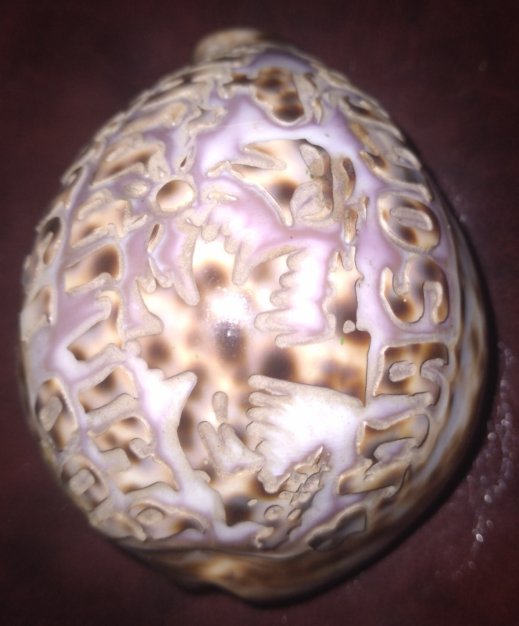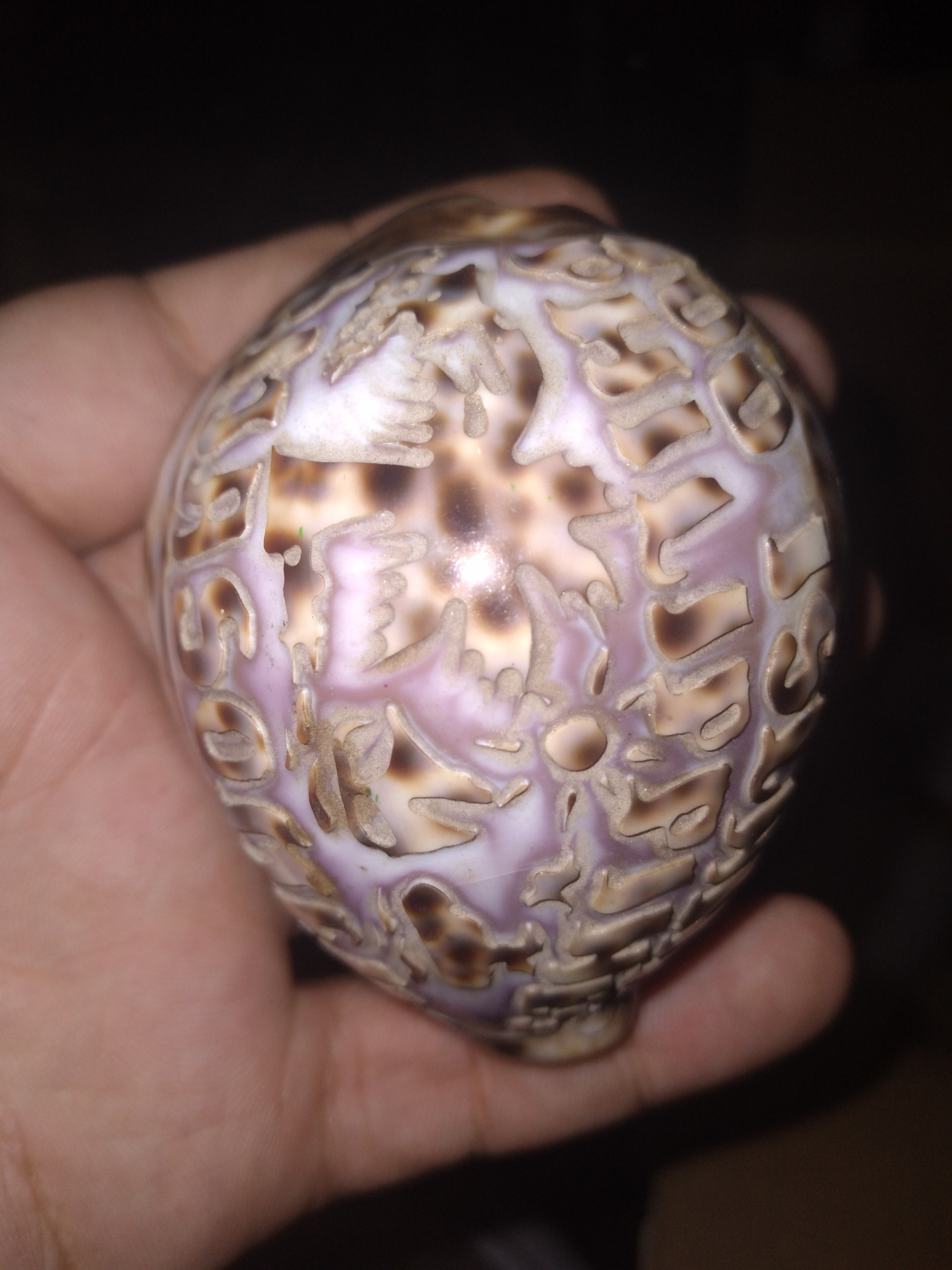 صدف غول پیکر 8 سانتی دریایی که از دبی خریداری شده و توسط یکی از هنرمندان حکاکی زیبای عکس خورشید و درخت کاج و جمله عاشقانه روش کنده شده .بسیار زیبا و دیدنی