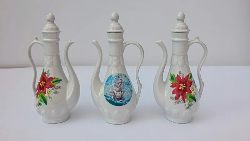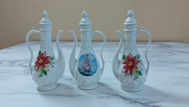 تعداد 3 عدد گلابپاش با درب به ارتفاع 23 سانت دوتا نقش گل قرمز دارن لبه هاشون پریدگی دارن تعمیر شده در عکس مشخص هست .گلابپاش که عکس کشتی روش داره کاملا سالم هست .فروش بصورت یکجا.