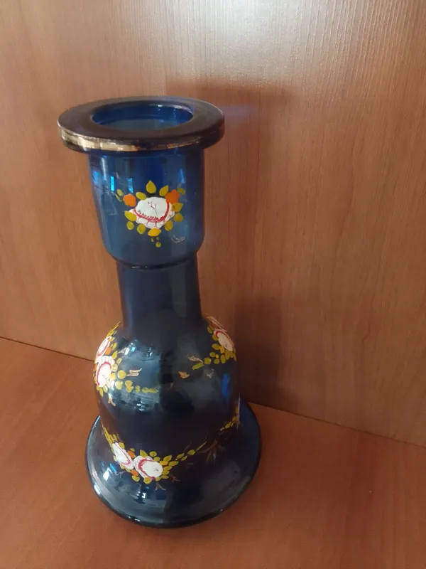 تنگ شیشه قلیان کوزه قلیون آبی سرمه ای طلایی گلدار گل گلی آنتیک قدیمی قد 29 سانت پهلوی گلدان گلدون دکوری