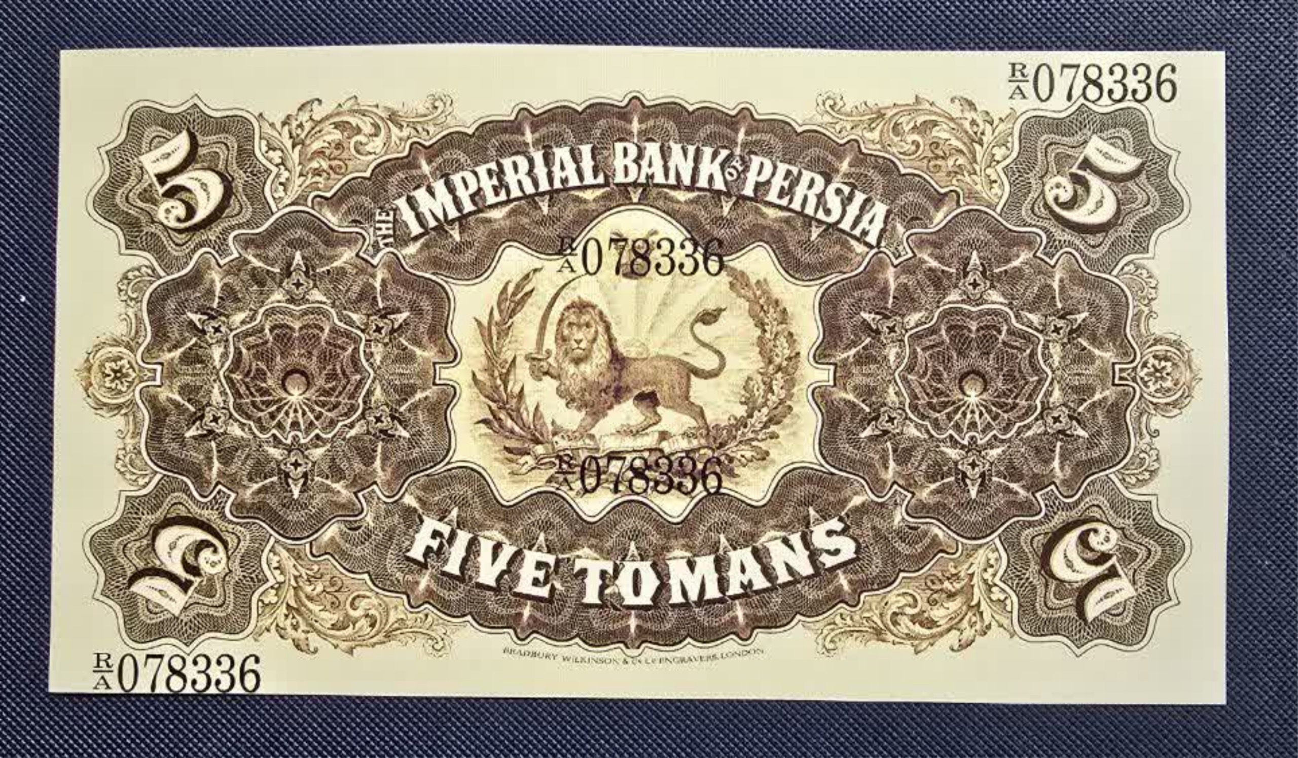 پنج تومان سری اول ناصرالدین شاه قاجار فقط در کرمان ادا خواهد شد با مهر رو و پشت قهوه ای با امضا آقای ا. اُ. وود و ای. سی. دالتون ، بسیار بسیار کمیاب و ارزنده، طرح و کپی این اسکناس از نسخه اصلی در انگلستان انجام شده و اندازه اصلی اسکناس میباشد.اصل این اسکناس بالای 600 میلیون تومان ارزش دارد.