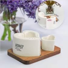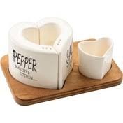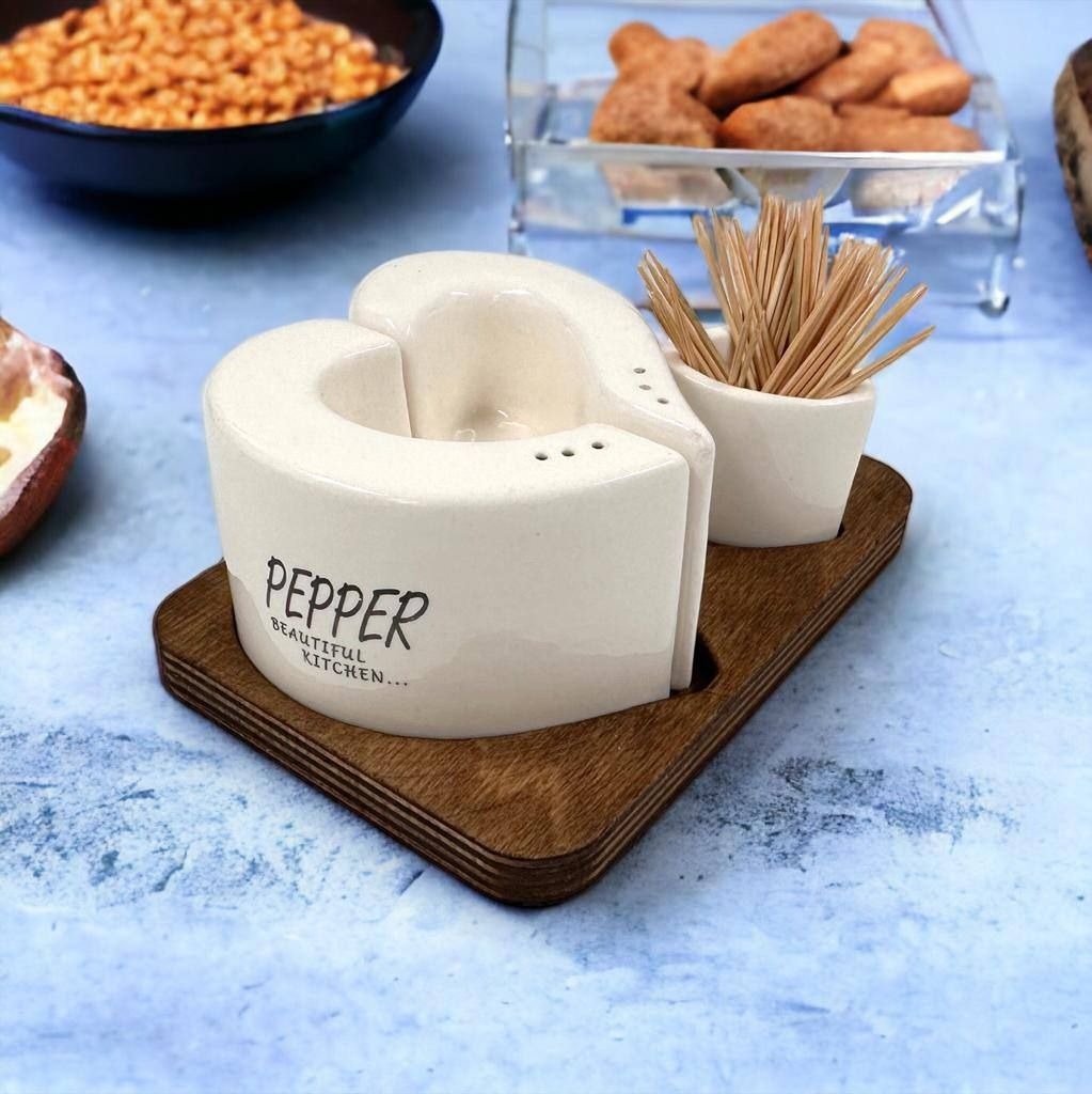 ست 3 تیکه نمک پاش و فلفل پاش بهمراه جای خلال طرح قلب جنس ظرف از سرامیک گرما دیده بهمراه یک لایه لعاب کاری در تمام سطح بیرونی ظرف میباشد، فضای داخلی ظرف برای عدم ارتباط مواد قضایی با ترکیبات شیمیایی لعاب نخورده است. بهمرا سینی چوبی