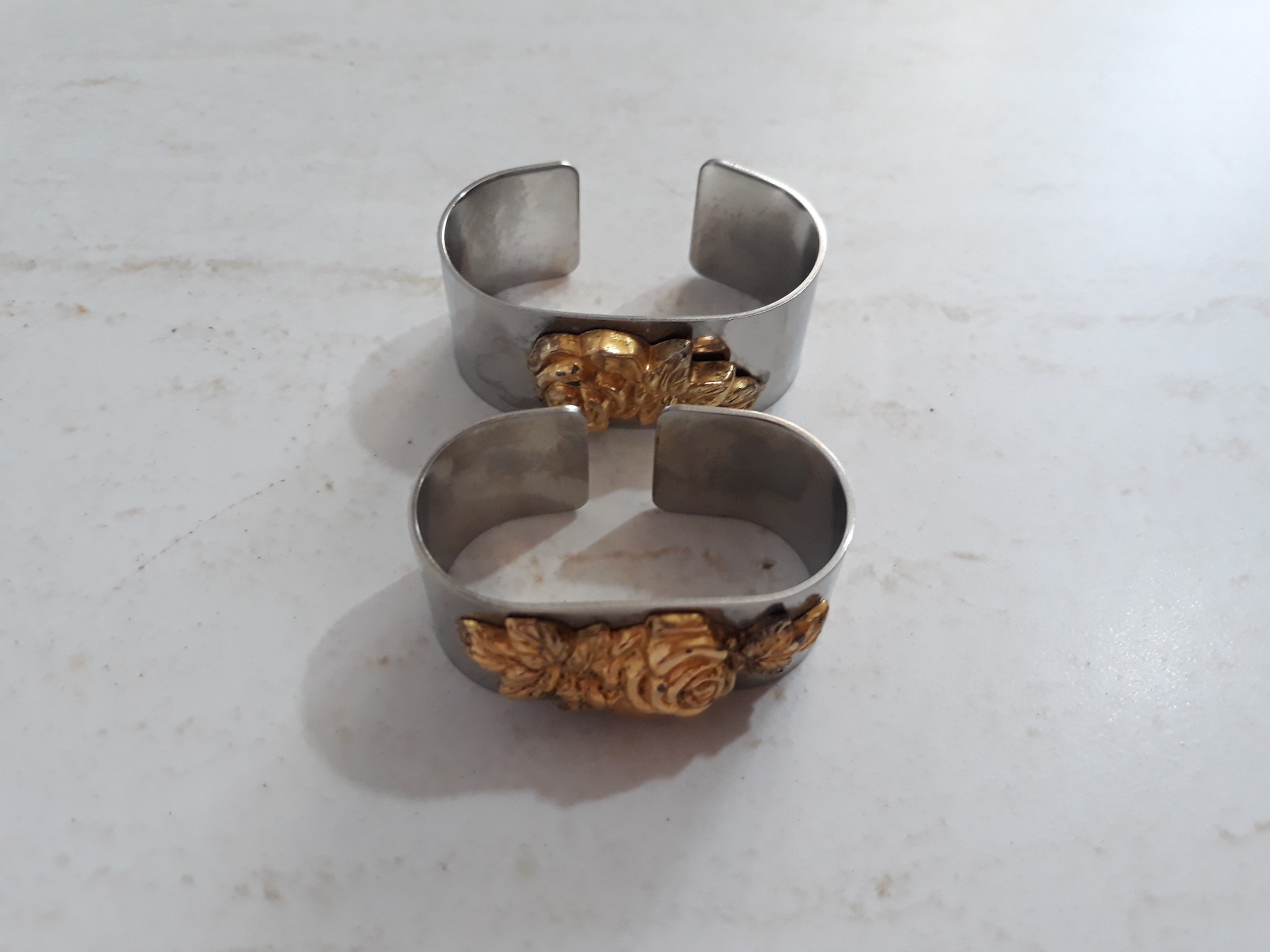 جفت دستمالبندهای سفره رومیزی فلزی ساخت usa آنتیک و کلکسیونی . در میزهای تشریفاتی دستمال پیشبند ها را در این حلقه قرار می دادند و در کنار سرویس پذیرایی برای میهمان در نظر می گرفتند تا در صورت تمایل از آن استفاده کند . گل های هر حلقه فرق می