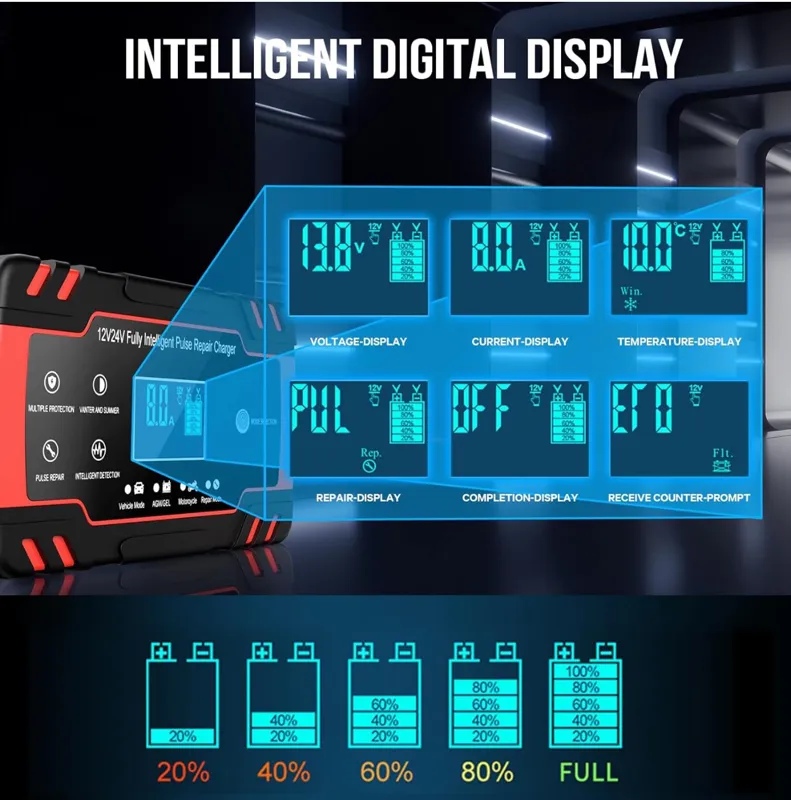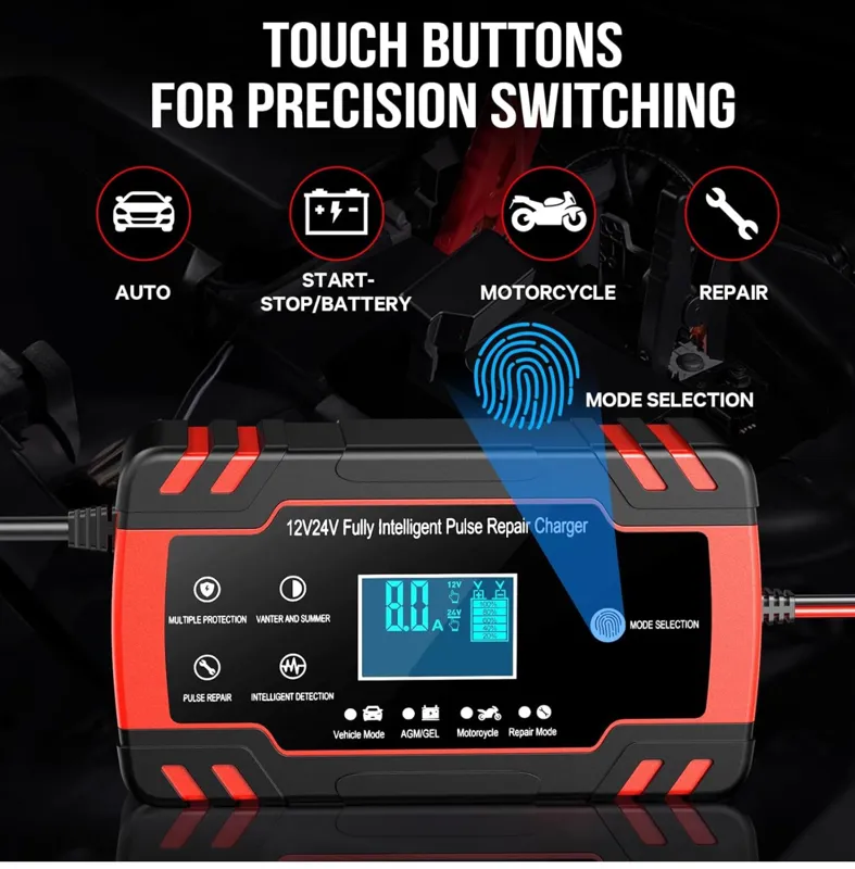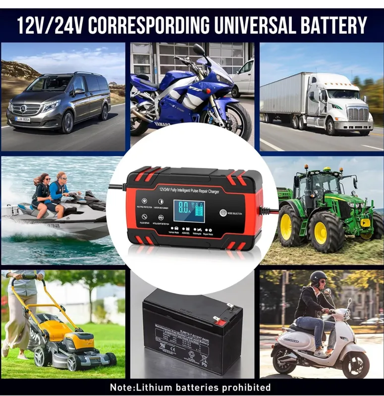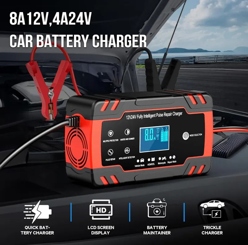 شارژر باتری ماشین Husgw، 8A 12V/4A 24V، شارژر باتری قابل حمل هوشمند خودرو، شارژر تعمیر و نگهداری پالس برای ماشین، موتورسیکلت، ماشین چمن زنی
