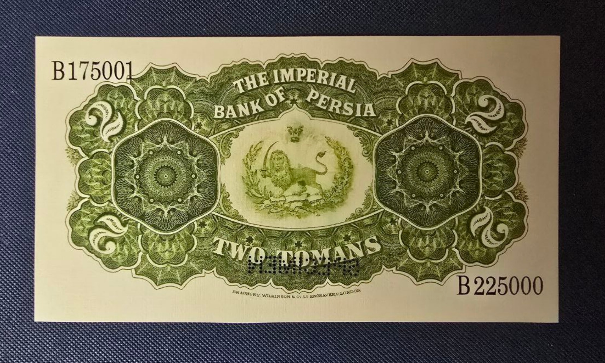 دو تومان سری اول ناصرالدین شاه قاجار اسپسیمن پشت سبز، با امضای آقای ژوزف رابینو و آرتور اف. گراندی .این اسکناس اگه اصلش رو دیدید با این کیفیت حدود 500 میلیون تومان است.کپی و اجرای طرح این اسکناس در انگلستان انجام شده و بسیار بسیار با ارزش برای ست کلکسیون آلبوم میباشد .