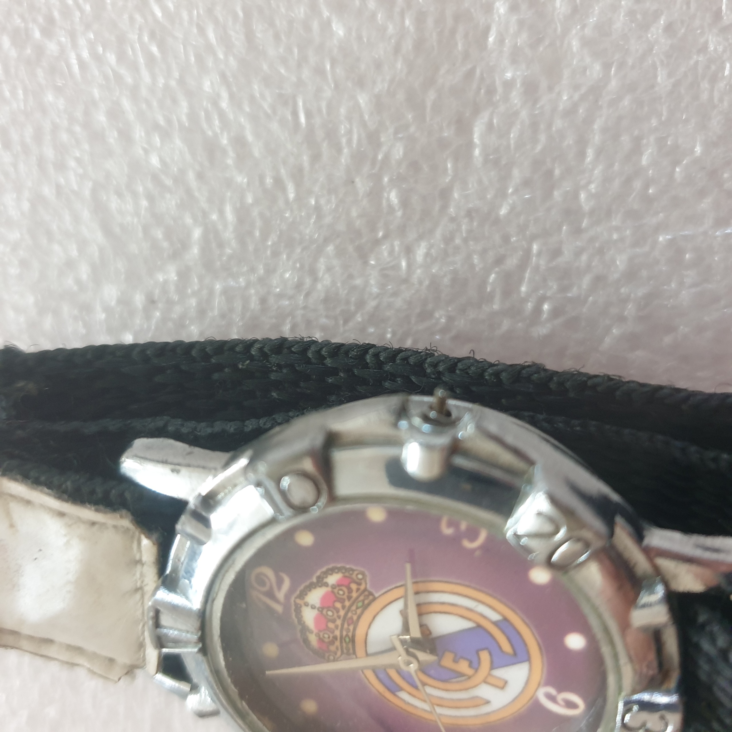 ساعت صفحه طرح باشگاه رئال مادرید بند پارچه ای فقط سر پیچ تنظیم نیست ولی با ناخن بیرون درمیاد و تنظیم میشه قیمت مناسب میزارم برای استفاده قطعات سالمه موتور
