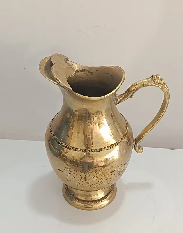 پارچ برنجی بسیار ضخیم با وزن 1/040،ارتفاع22سانت،نقشدار و احتمالا کار هندوستان هستش،بسیار با کیفیت و قابل مقایسه نیست با پارچهای کنار سماوری ،بسیار زیبا و خاص