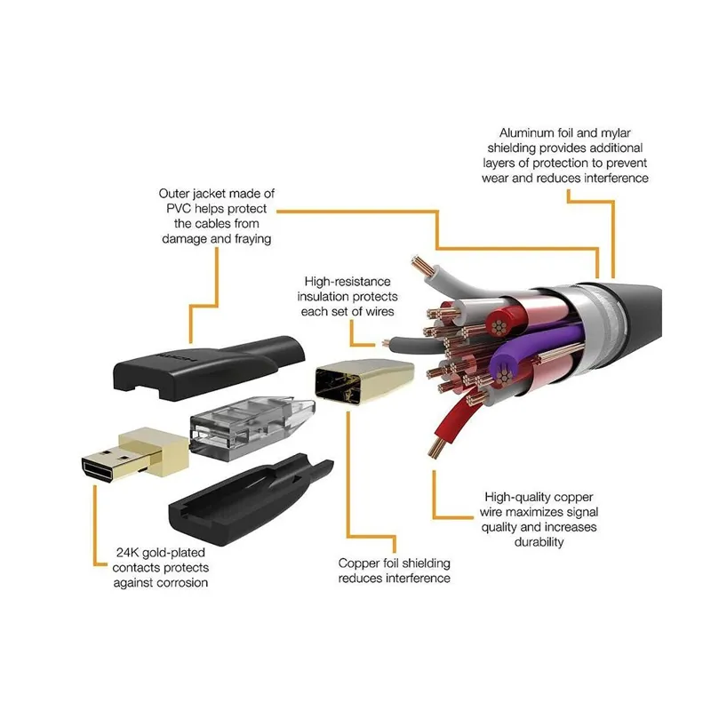 طراحی بادوام : بهره وری از روکش طلا بر روی سوکت ها . هادی های مسی جامد و پوشش فلزی کامل برای استحکام و اتصال با کارایی بالا .