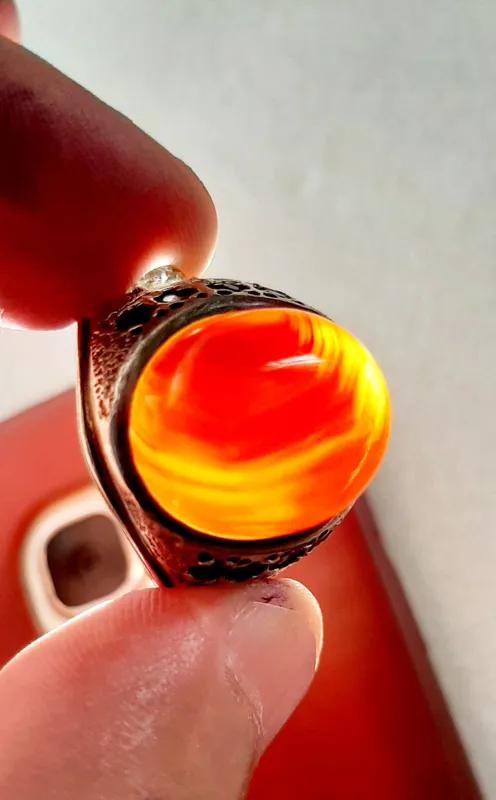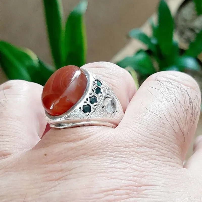عقیق یمنی بسیار زیبا و قدیمی سراسر رگه دار چهار کله آب دار و تیغاب و طوق دار با مخراجکاری 8قطعه زمرد کلمبیا و یک قطعه در نجف و یک قطعه فیروزه با رکاب دستساز جهت دیدن عکسهای بیشتر صفحات بعدی پست را ورق بزنید از کالاهای دیگر ما دیدن کنیددوستان و همراهان گرامی