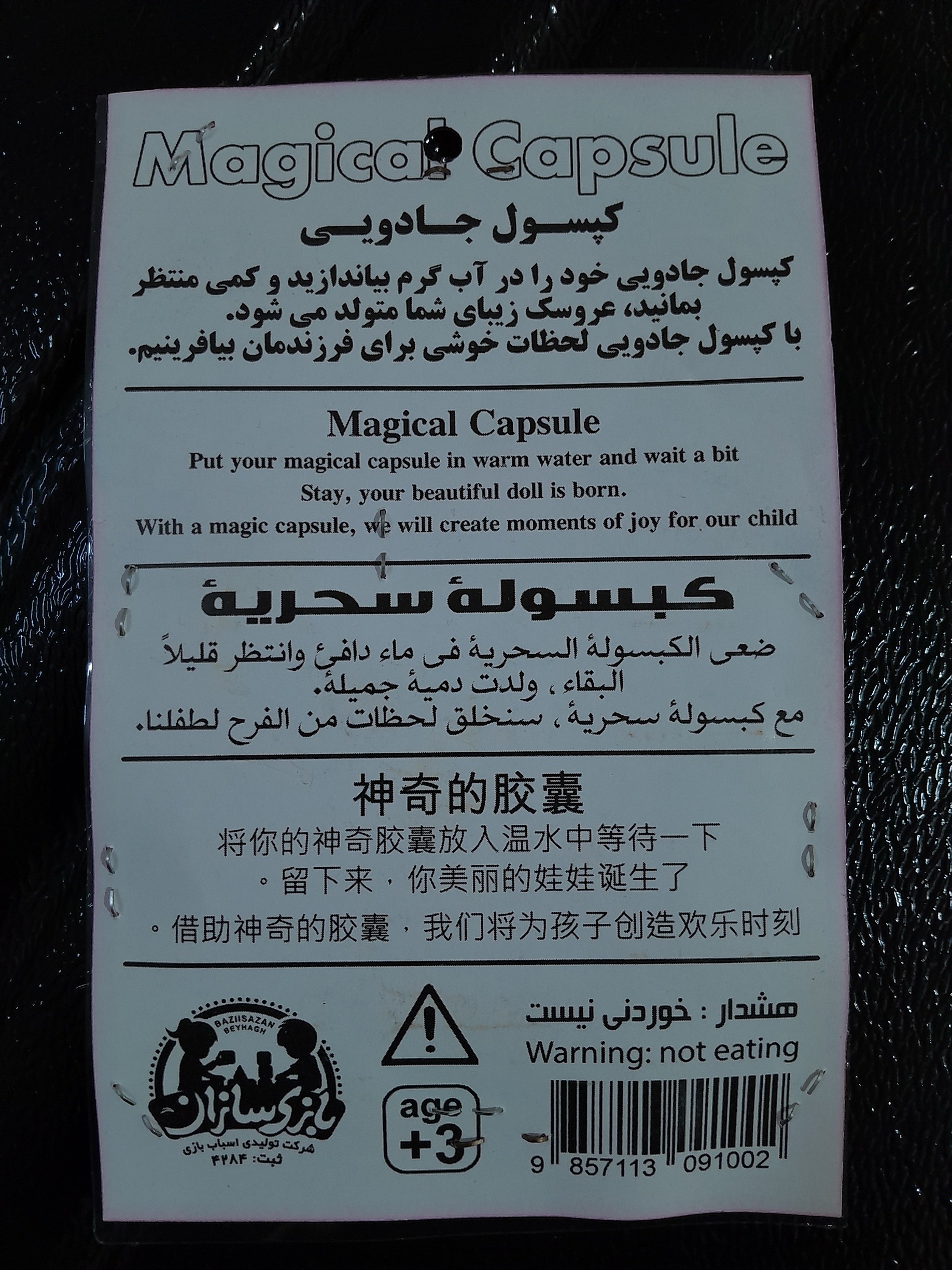 انداختن کپسول سحرآمیز در آب گرم بعد از چند ثانیه این کپسول تبدیل به یک عروسک زیبا خواهد شد ، کپسول جادویی می تواند لحظاتی شاد و مهیج را در چشن تولد ، مهد کودک ، حمام و هر گونه جمع کودکانه برای کودکان فرآهم آورد.