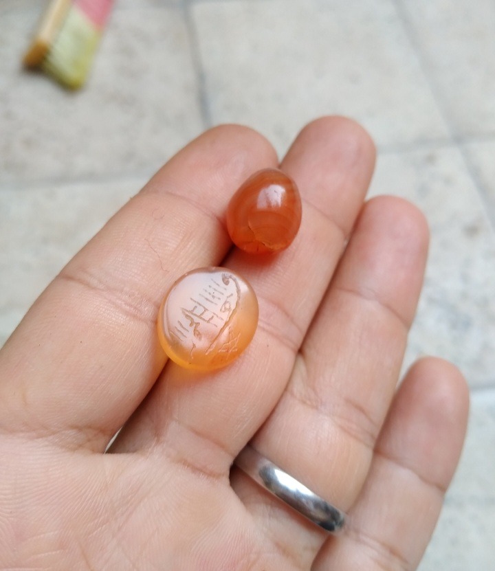 یه مهره و یک عدد نگین هردو یمنی هر دو کهنه بارنگ طبیعی بدون بهسازی مهره 2سانتی بارنگ پرتقالی طوق دار سالم.و نگین کهنه یمنی با خط کهنه حرز شرف الشمس که با دست حکاکی شده و کاملا سالمه ترک رگه شکستگی اصلا نداره هم سنگ هم خط روش کهنه هست.2سانت طول نگین هست.توی بازار کمیابه و فقط نگین تا 4ملیون تومن قیمت داره.با ضمانت خرید 5روزه.