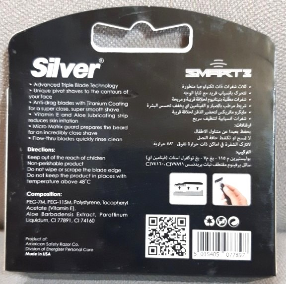 یدک خود تراش چندبار مصرف 3 لبه «اسمارت تولیدی متفاوت از برند «سیلور» (Silver) است. سری 3 لبه تیغ از جنس تیتانیوم دارد. این خودتراش، اولین چندبار مصرف مخصوص آقایان است که از 3 لبه تیغ بهره می برد. استفاده از آن اصلاحی بی عیب و بدون حساسیت را برای مصرف کننده به ارمغان می آورد. در بسته بندی این کالا 4 عدد سری یدک هست در قسمت بالایی تیغهای اسمارت، نوار صابونی حاوی ویتامین E و عصاره ی Aloe Vera تعبیه شده است که هنگام تماس با آب سطح پوست را لغزنده می کند تا تیغ راحتتر حرکت کند.