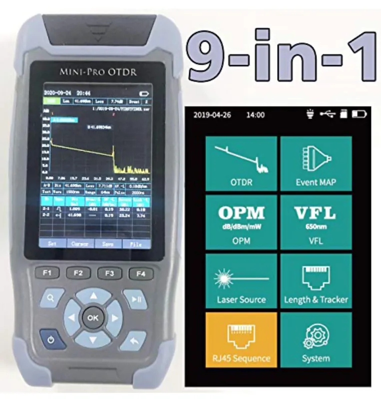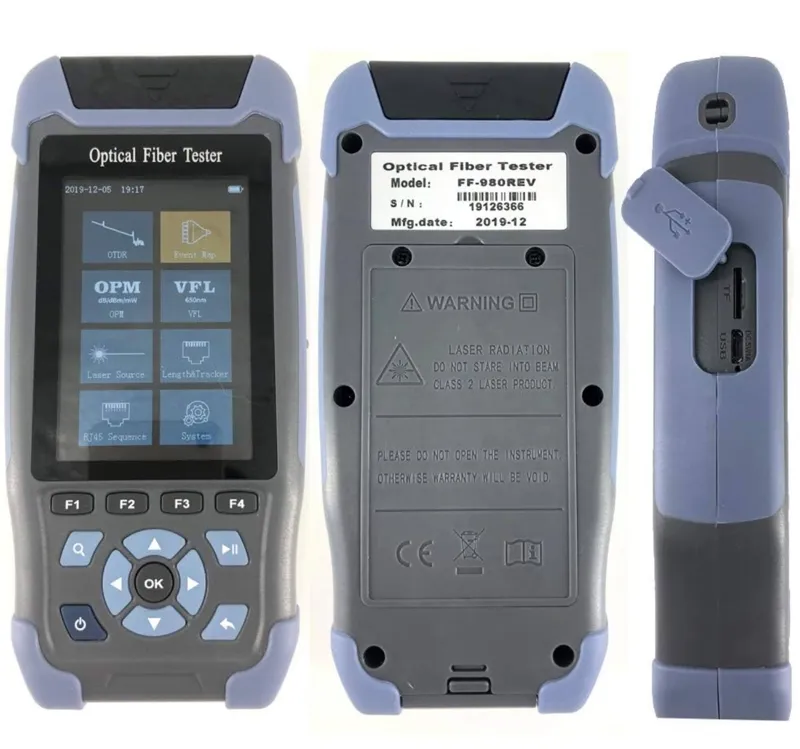 مینی پرو OTDR مدل: FF-980REV طول موج: 1310 و 1550 نانومتر محدوده دینامیکی: 24/22 دسیبل محدوده تست: 3 متر تا 64 کیلومتر 9 عملکرد در 1 دستگاه 1) OTDR 2) نقشه رویداد 3) منبع نور نوری 4) توانسنج نوری 5) عیبیاب بصری 6) توالی کابل اترنت RJ45 7) فاصله کابل اترنت 8) ترکر کابل اترنت 9) چراغ LED