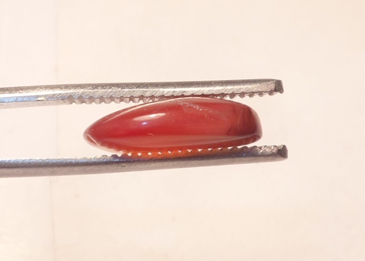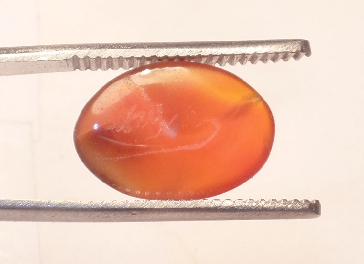 طرح : یک قطعه نگین عقیق پرتقالی با لکه مشکی و رگه سفید در پشت سنگ خوش رنگ و خوش طبع و با تراش بیضی نامتقارن دیواره دار رو و زیر نسبتا محدب. پشت سنگ ذکر شریفه ( شرف الشمس ) بصورت سطحی و خراش مانند حکاکی گردیده است. نگین دارای یخی طبیعی و برص یخی