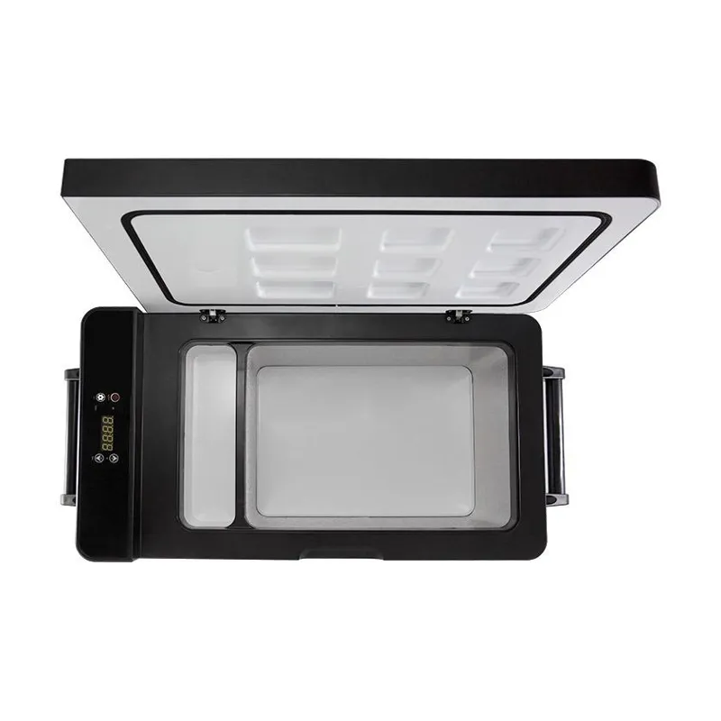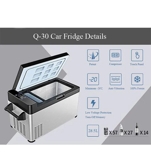 محصولی را که مشاهده میکنید یخچال و فریزر 30 لیتری صندوقی است با توجه به فصل گرما و سفرهای تابستانی نیاز به یک یخچال برای لذت بردن از سفر در هر خودرو مشاهده میشود یکی از ویژگیهای مثبت این یخچال و فریزر قابلیت کارکرد آن با برق 12 و 24 ولت است، این موضوع موجب میشود تا بتوانید از این یخچال و فریزر در خودروهای سواری استفاده کنید. این محصول انرژی موردنیاز خود را از بخش فندکی خودرو تامین میکند. نحوه راه اندازی این دستگاه در خودرود توسط سیم رابط فندکی می باشد که در جا فندکی اتومبیل قرار گرفته و برق را از اتومبیل به دستگاه انتقال می دهد و با مصرف ناچیز برق هیچگونه اسیبی به باتری و کارکرد اتومبیل نمی رساند.یخچال و فریزر اتومبیل را میتوان در منازل، اطاق خواب، محل کار، فروشگاه و ... استفاده نمود. داخل درب و بدنه های این دستگاه تماما فوم مخصوص (Polyurethane) تزریق گردیده که بصورت نوعی عایق عمل نموده و کمترین تبادل حرارتی و برودتی را با دمای محیط دارد. ویژگی بارز یخچال و فریزر ماشین Q-30 این است که کم حجم ترین مدل یخچال و فریزر کمپرسور با (حجم 30 لیتر) است. این مدل حتی توسط خانمها قابل حمل است ، زیرا وزن آن 14.7 کیلوگرم است. اگر سفر رفتن را دوست دارید و آشپزی خانگی را ترجیح می دهید ، پس این یک لوازم خانگی مهم و ضروری است. یخچال و فریزر آنقدر جمع و جور است که بین صندلی های عقب و جلوی خودرو قرار می گیرد. از ویژگی های این مدل می توان به قابلیت حمل و نقل اسان ان اشاره کرد. با وجود فشردگی آن ، فضای داخلی عمودی کافی است تا بطری های 1.5 لیتری را در خود جای دهد. یک عامل مهم این است که عایق حرارتی بدون استفاده از فوم پلی اورتان ساخته می شود.