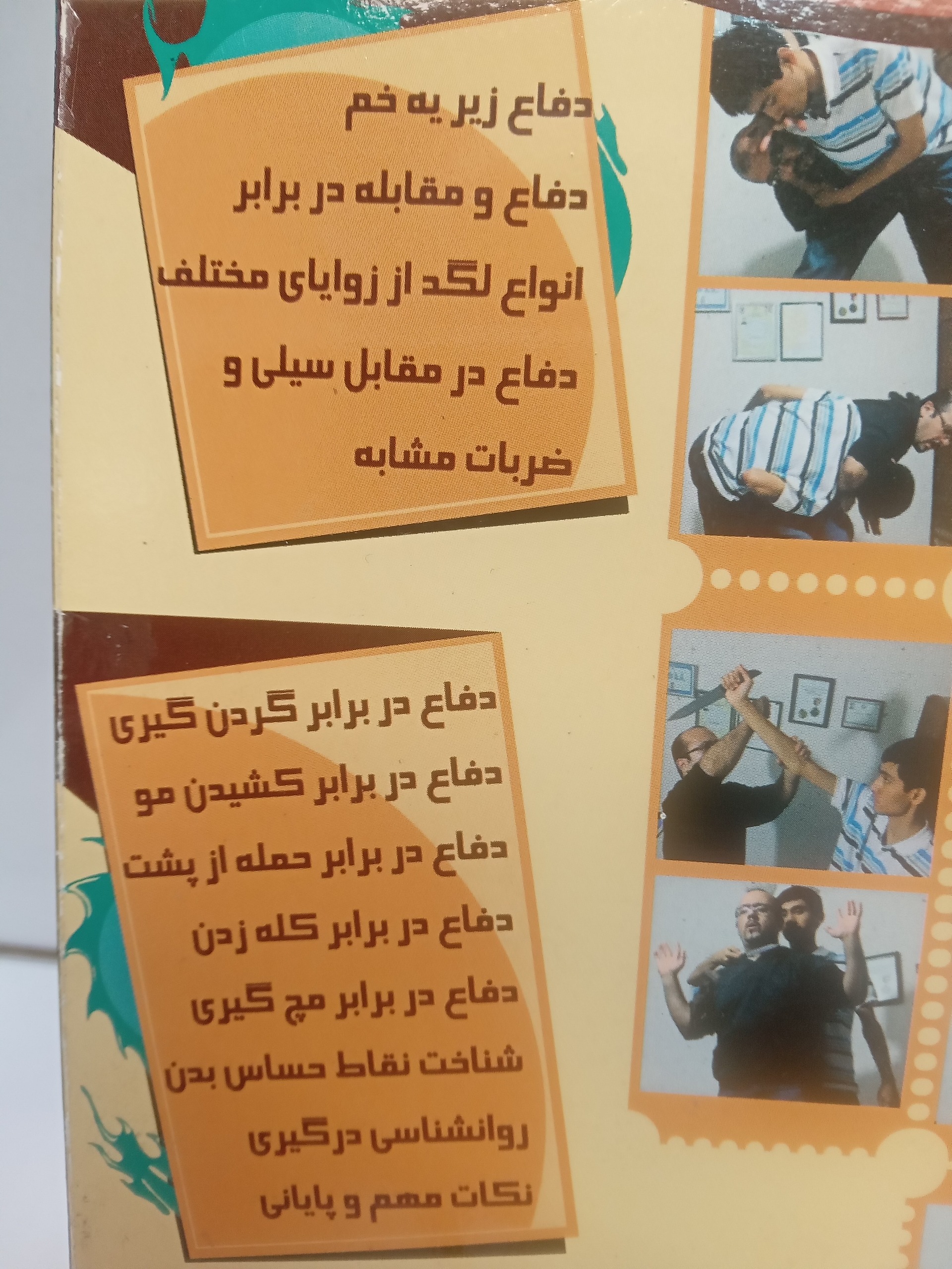 دفاع و مقابله در برابر نواع لگد از زاویههای مختلف دفاع در مقابل سیلی و ضربات مشابه مشابه دفاع در برابر گردن گیری کشیدن مو حمل از پشت مچ گیری و ...