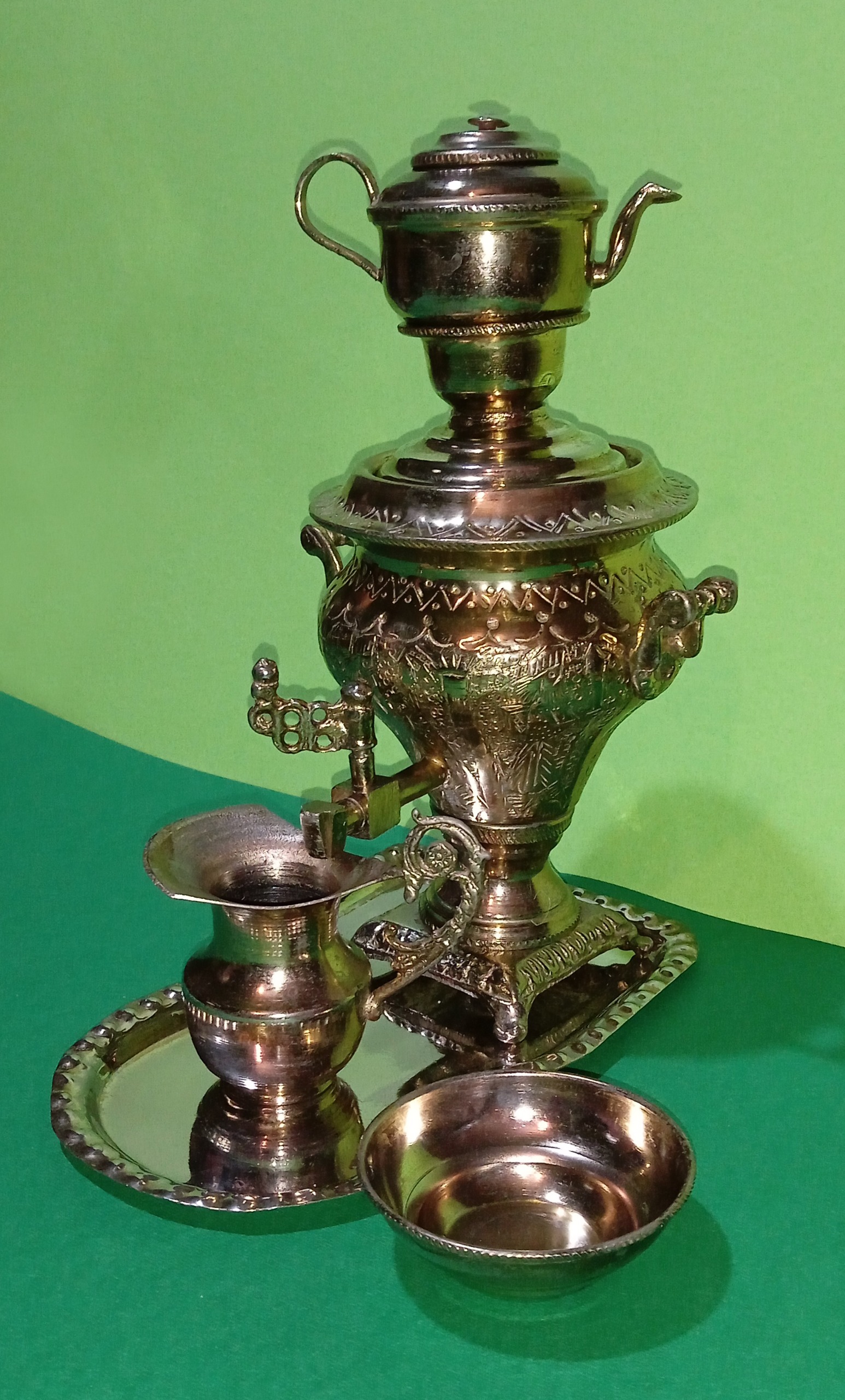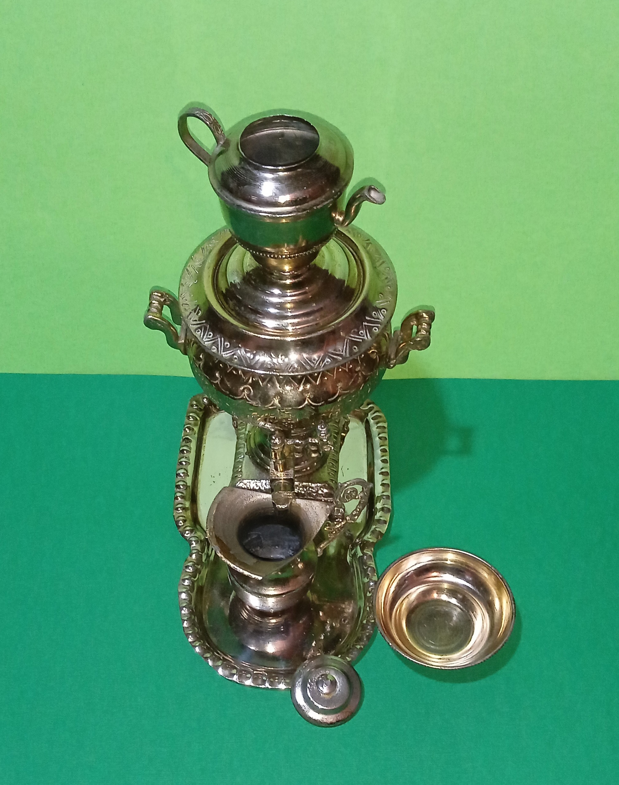رنگ سینی سماور از حالت طلایی در آمده و ممکن است در بعضی از نقاط دیگر هم اثرات دست دوم بودن مانند ضدگی و خوردگی ریز مشهود باشد ، ما هم با تمامی این نکات آن را در دسته ( دست دوم ) قرار دادیم ، لطفاً در خرید خود دقت نمایید