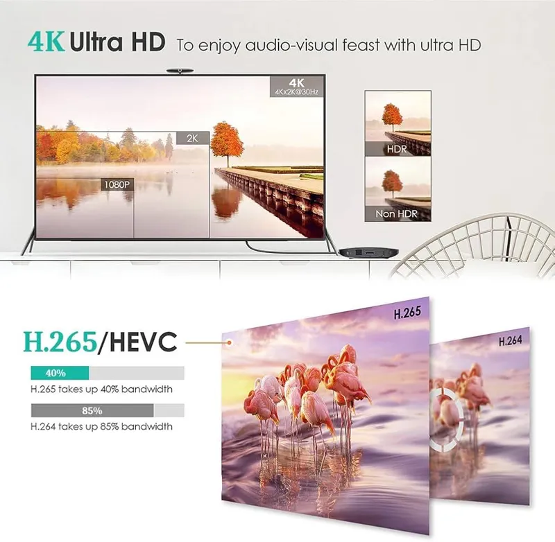 Decodifica HD 4K e H.265 پشتیبانی از تلویزیون TUREWELL برای رمزگشایی 4K و H.265 HD به صورت رایگان 4k * 2k با سرعت 100 مگابیت بر ثانیه با یک دید کامل و بدون تعریف و پخش ویدئو.