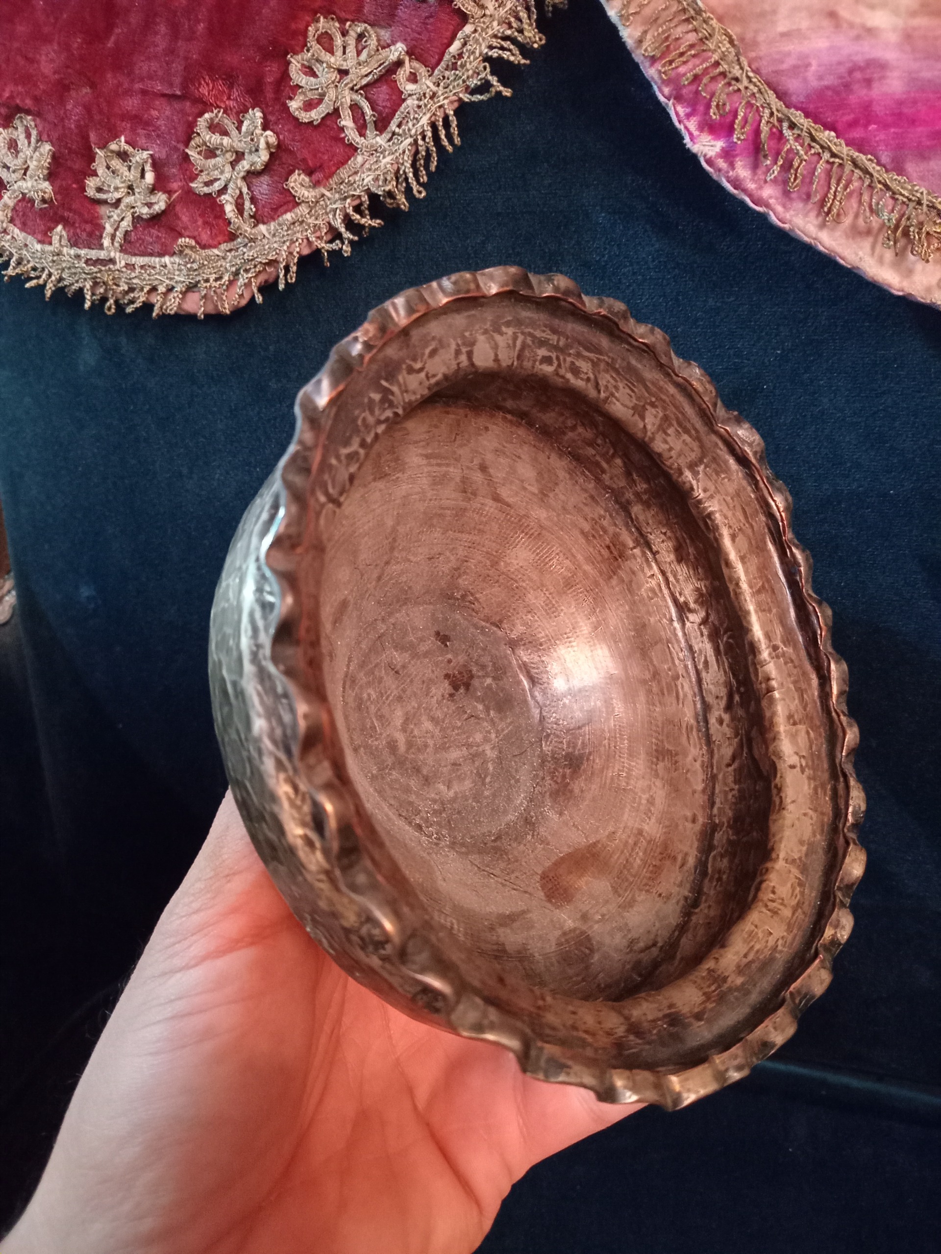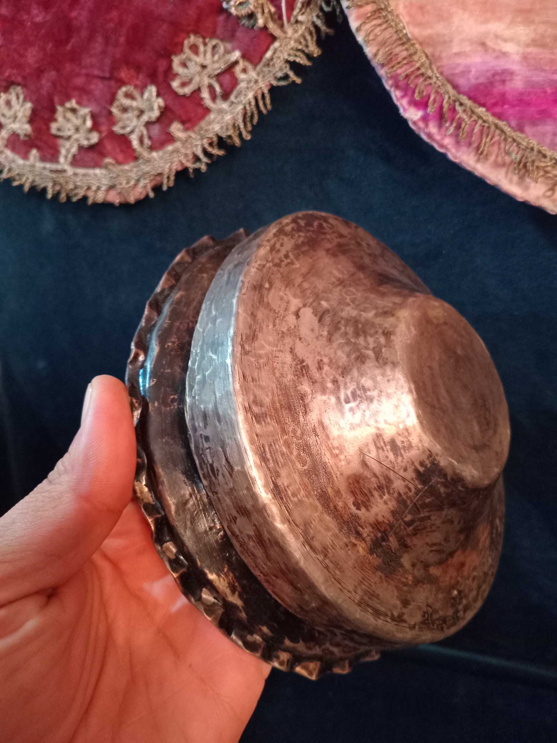 دخل یا تاس مسی چکشی بسیار زیبا کلکسیونی قدیمی سنگین و جوندار. بیایین بخرید.سایز کمیاب