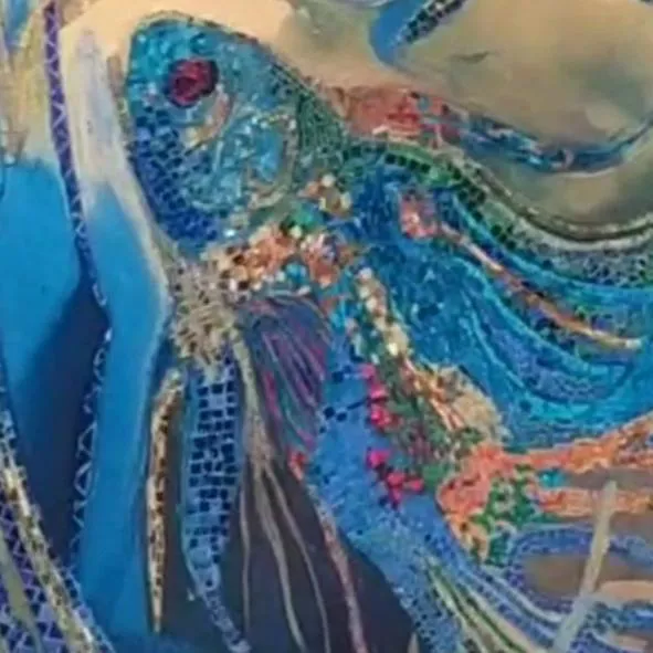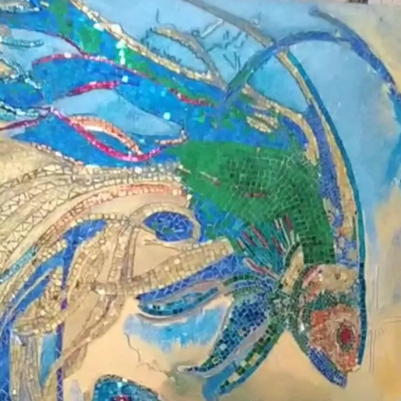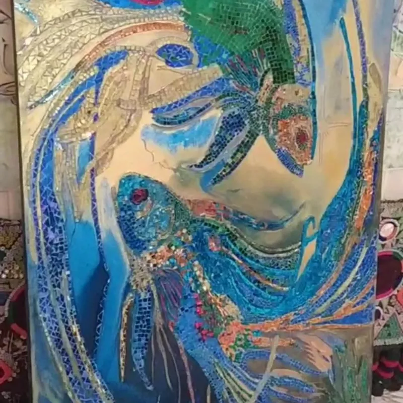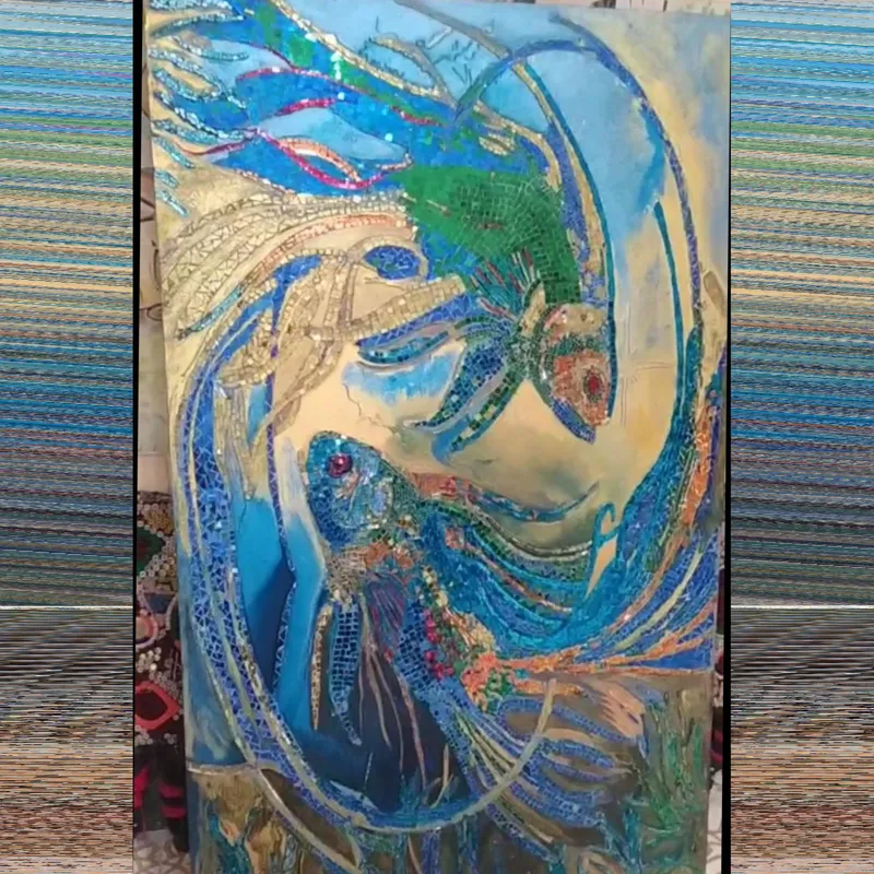 تابلو دوماهی اثر استاد عطاپور شامل پنج هزار قطعه آیینه رنگی و رنگهای ویترای روی ام دی اف دارای فرم برای نصب روی دیوار ( پانصد ساعت )