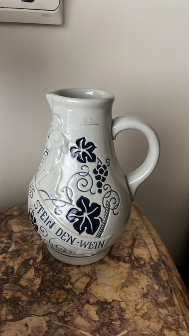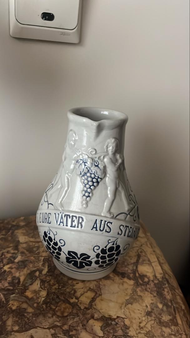 پارچ قدیمی آلمانی از جنس سرامیک یا استون ور به رنگ طوسی روشن با نقاشی کار دست