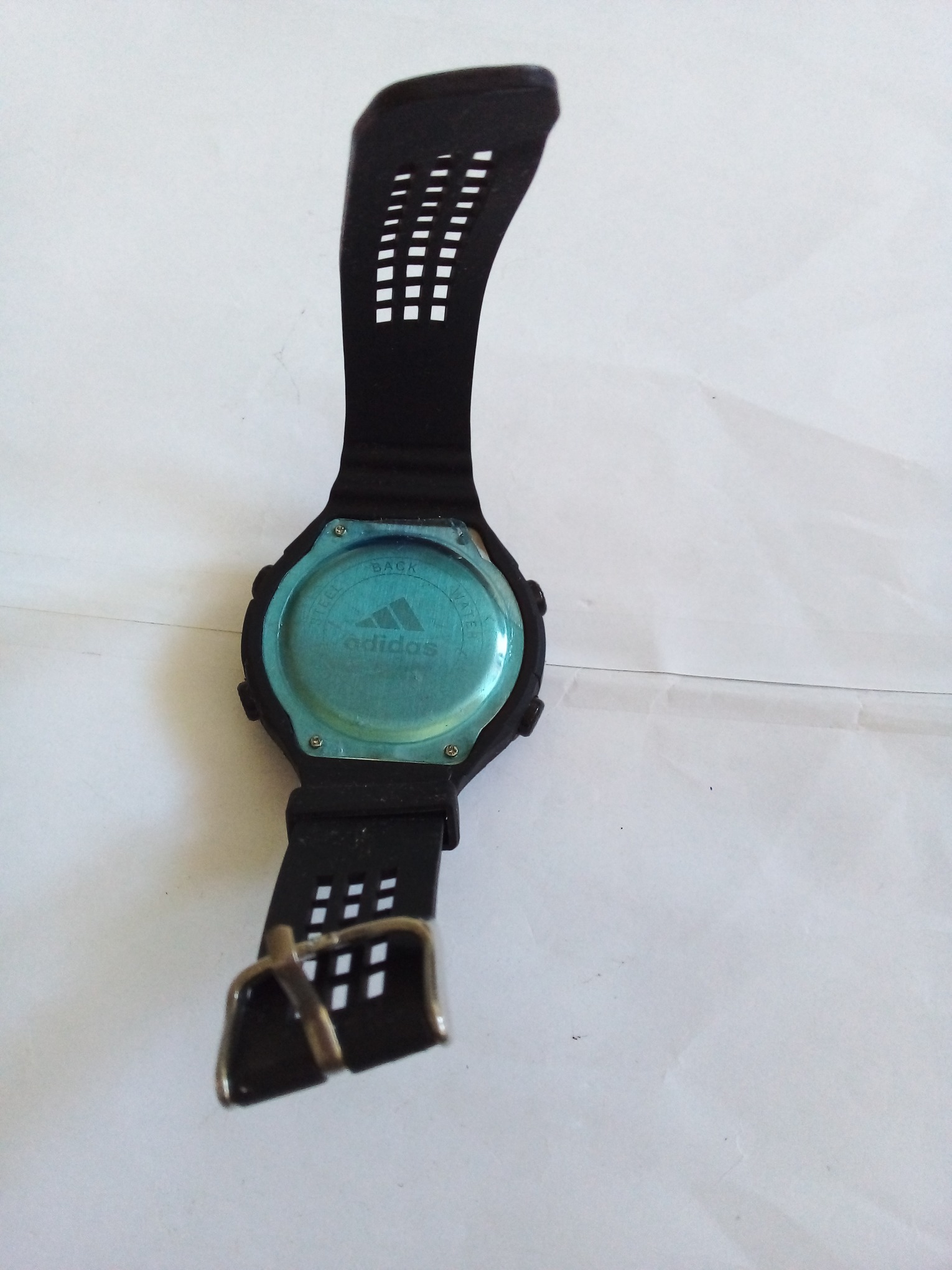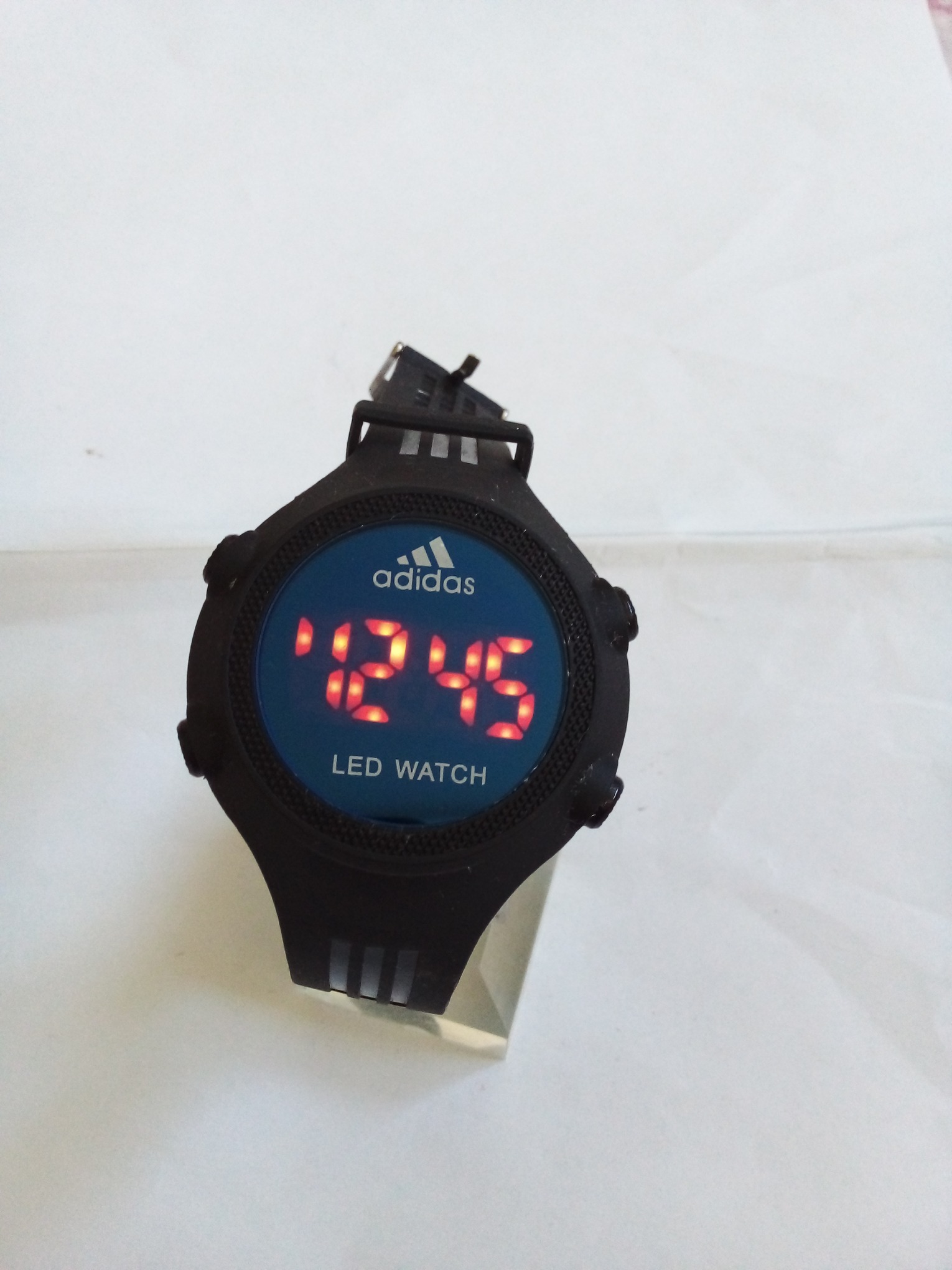 درود وروز بخیر خدمت عزیزان کاربر و سایت محترم ایسام . ساعت اسپرت پسرانه ادیداس با صفحه ابی وLED با 4 شاسی یا پمپ طرفین وبند وسگک که ارم ادیداس دارد . روی درب پشت پلاستیک ابی رنگش هست یعنی کاملا سالمه ودر حال حاضر کار میکند که در عکسها میبینید . عزیزان