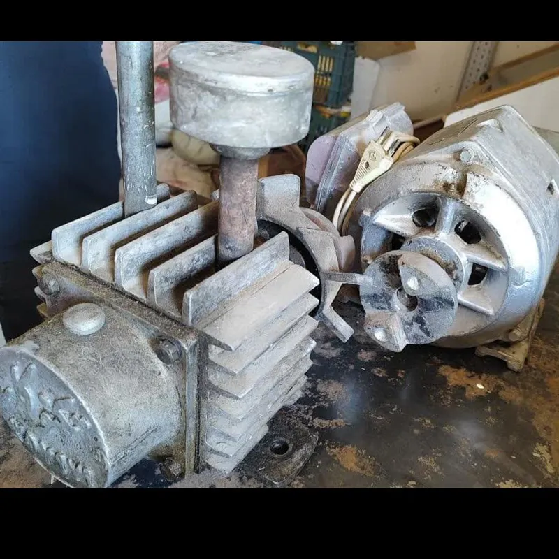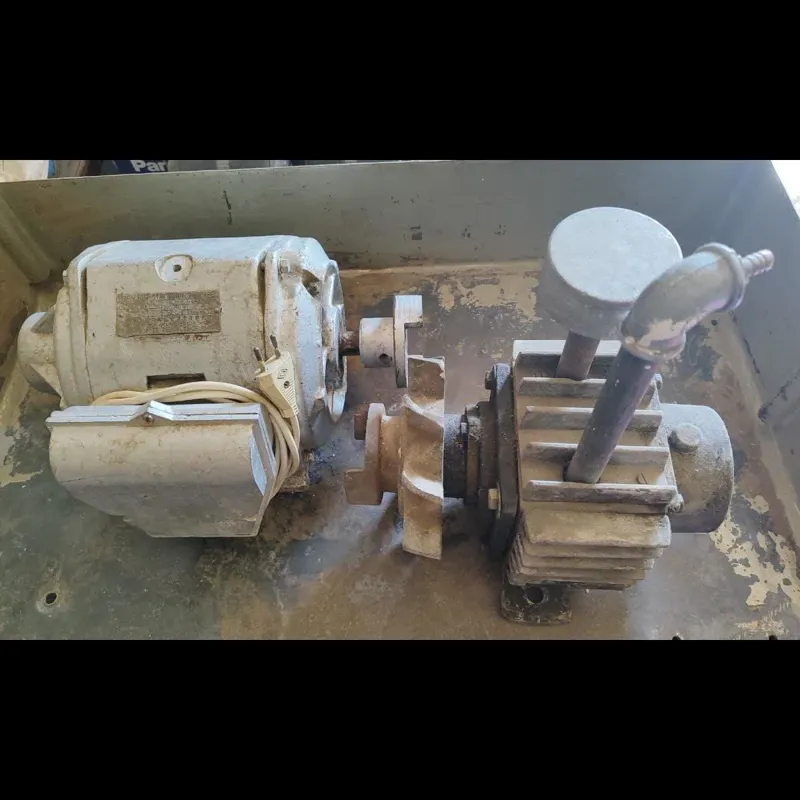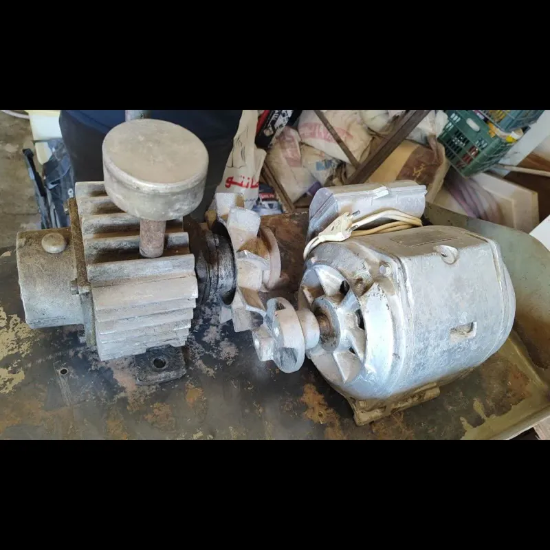 الکتروموتور با توان یک اسب که با پمپ کوپل می شود. یکی از پره های سر پمپ شکسته است که البته تأثیر چندانی ندارد. الکتروموتور کار می کند و تازه سیم پیچی شده است. ولی از عملکرد پمپ اطلاعی ندارم و نمیدانم اصلاً کاربردش چیست. الکتروموتور در حین چرخاندن با دست کمی سفت است و لی به برق که زده می شود عالی کار می کند.