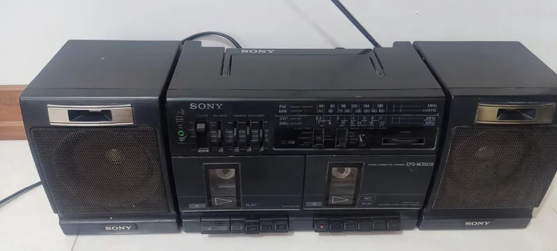 رادیو ضبط دو کاست سونی رادیو چهار موج اف ام دار با گیرندگی بسیار عالی و قوی بدنه کاملا سالم بدون شکستگی زیرش چندتا خط و خش دارد هر دو کاست سالم جلو عقب برن نوار سالم فقط یکی دو تا از پلاستیک سر دکمه های کاست شل هستند ولی در کارکرد تاثیری ندارد محل اتصال سیم باند هم یکی از پلاستیک گیره کم شده که مشکلی نداره و باند کار میکنه سوالی بود لطفاً قبل از خرید بپرسید و از سایر کالاهای متنوع فروشگاه بازدید فرمایید