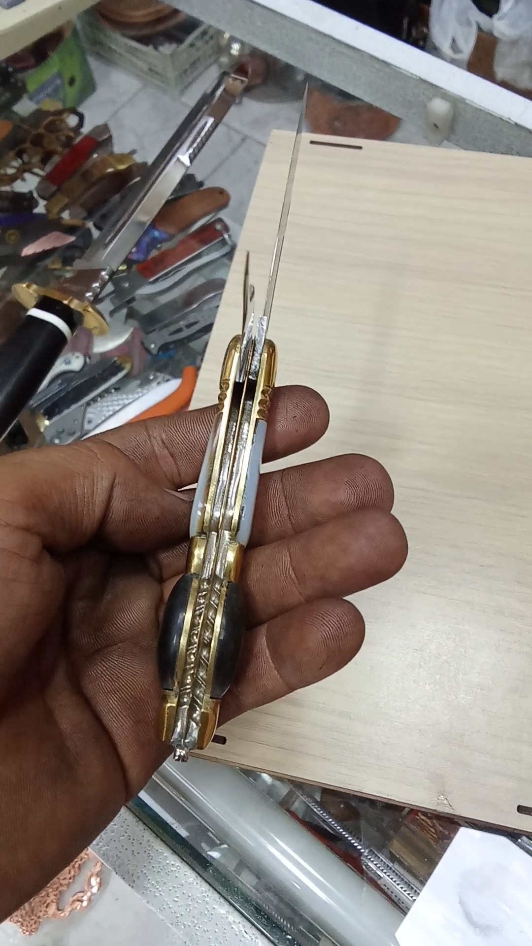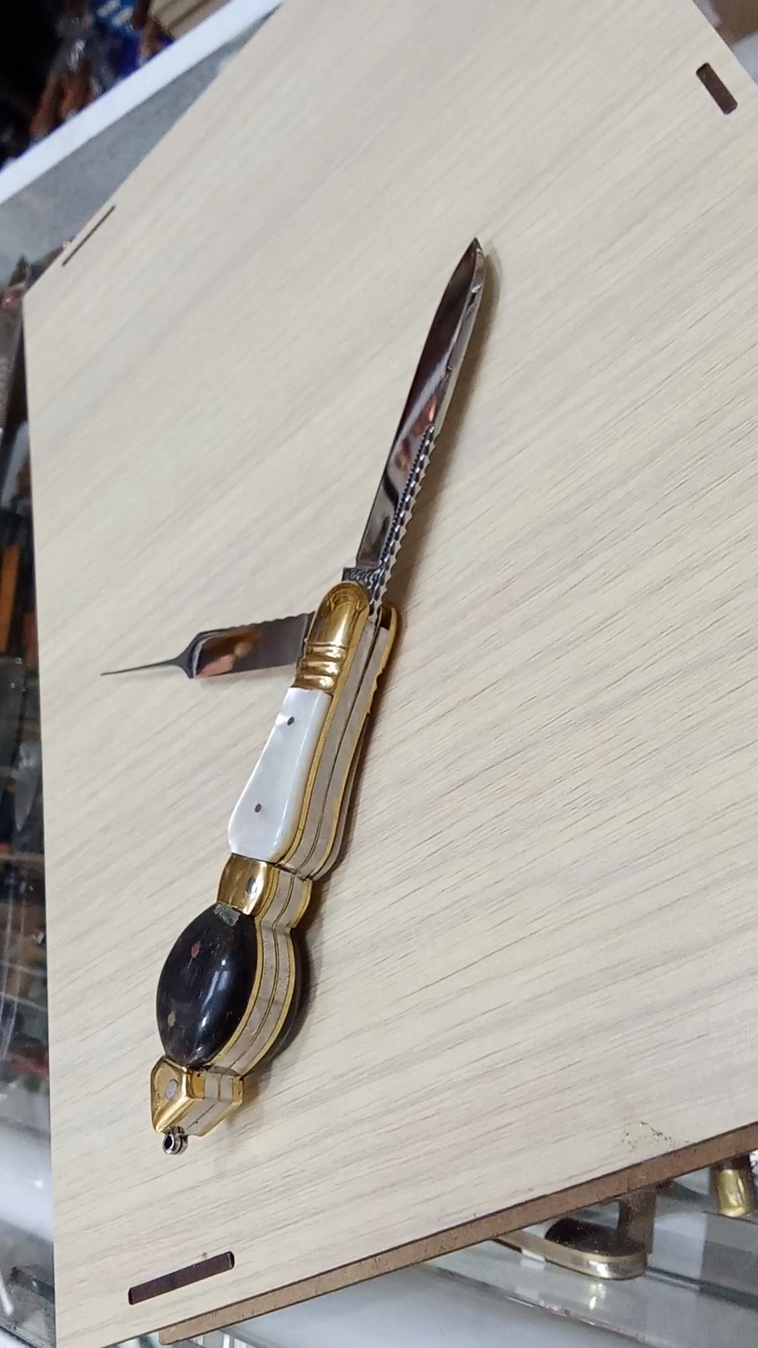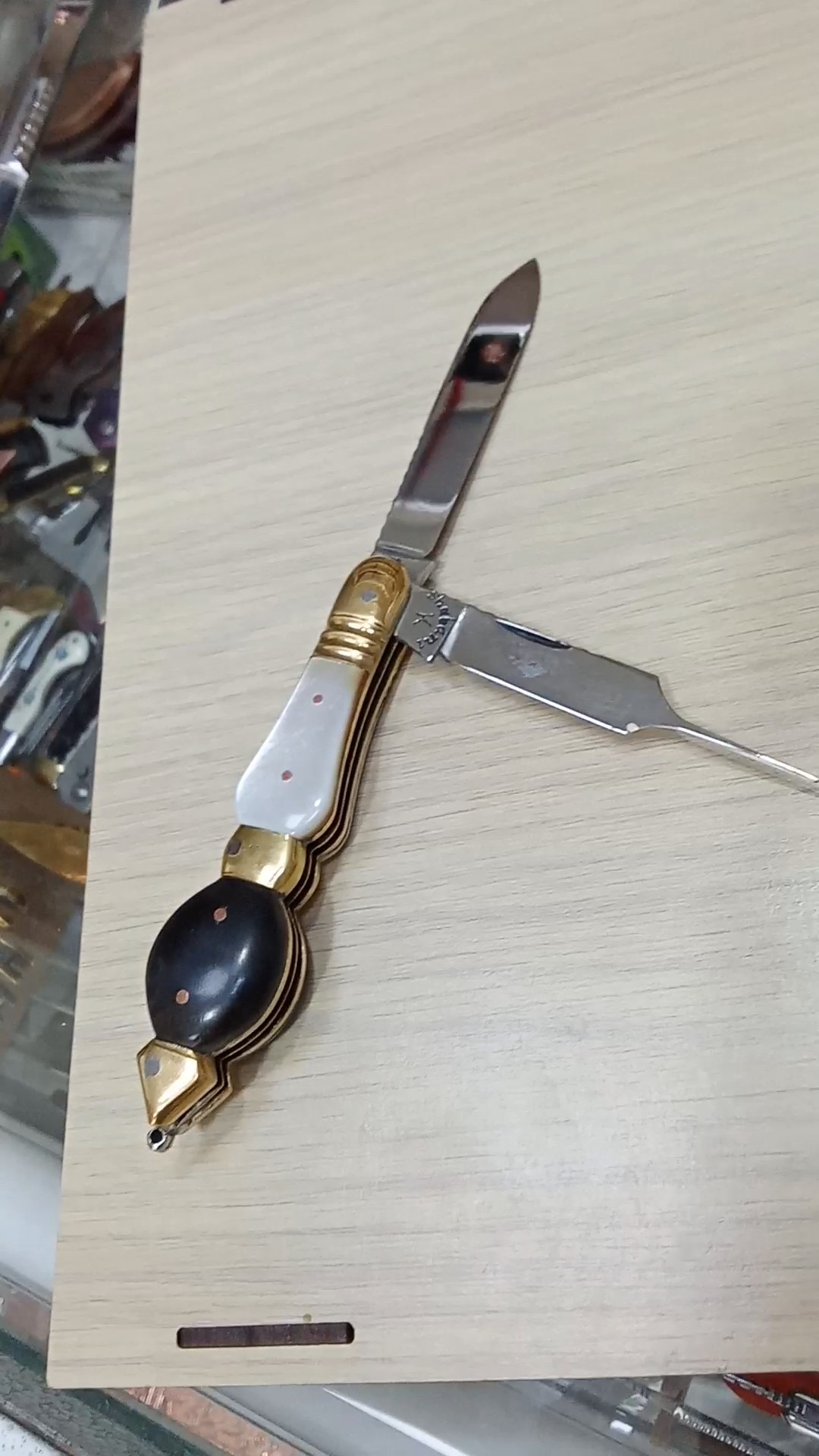 چاقو فوق کلکسیونی ونمایشی دکوری استاد کریم شعبانی دوتیغه دوکاره دورنگ دسته صدفی باربند برنج مسمار تیغه کنس آبدیده تیزوبرا جودان کاری سوهان کاری داخل دسته وپشت دسته وتیغع پرکار ریزه کاری صفرتا صد کاردست کاری کلکسیونی فاخر وکمیاب وکلیه سفارشات انواع چاقو کلکسیونی وبازاری وقدیمی پذیرفته میشود