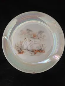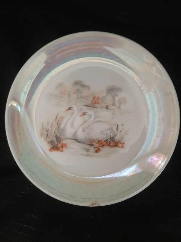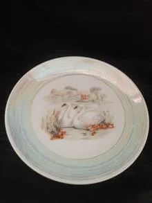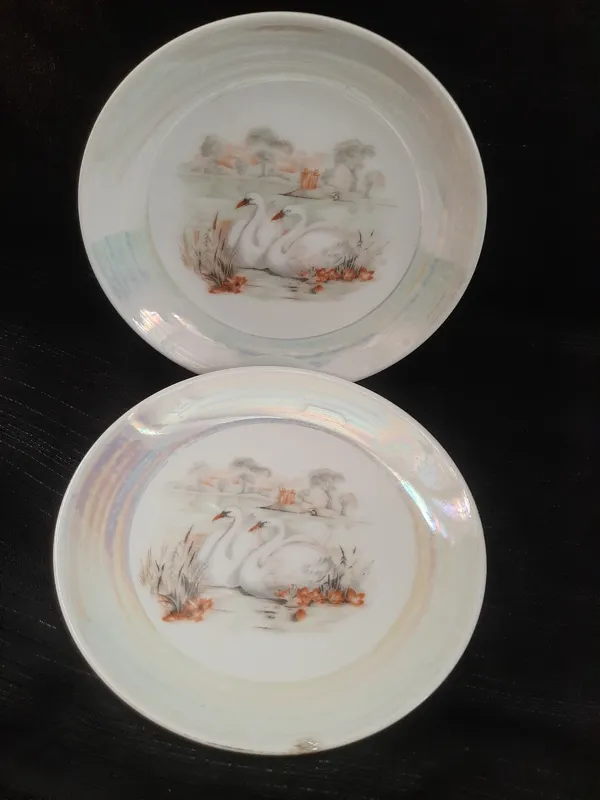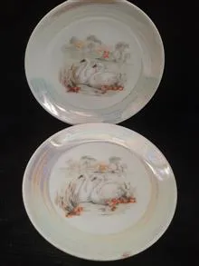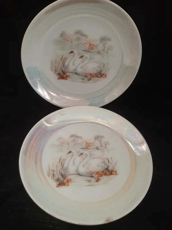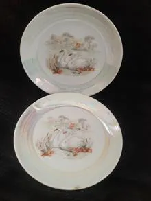 دو عدد پیش دستی دیوارکوب هفت رنگ ژاپن قطر 15 طرح قو دست دوم یکیش پایین یک لبپری یک میلی از رو داره که در قسمت پایین هست دومی و بقایش سالم دورش هفت رنگه عمر 60 سال خط و خش ریزی وجود دارد