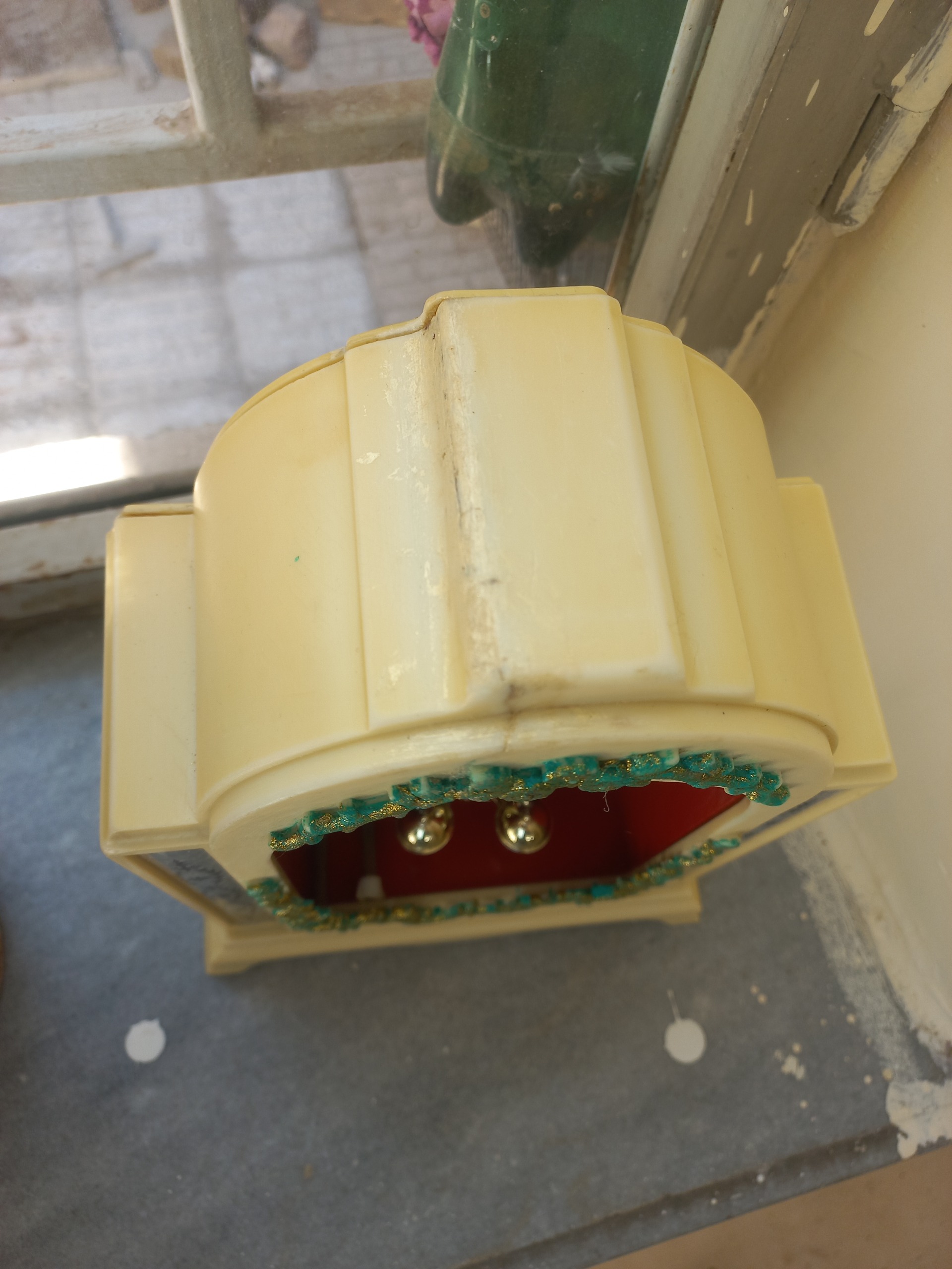 ساعت قدیمی طبق تصویر کار میکنه زنگ و ساعت ولی بدنه از بالا شکسته ترمیم شده پشتش لق هست باید درست بشه شیشه نداره طبق تصویر در کل نیاز به رسیدگی ظاهری دارد