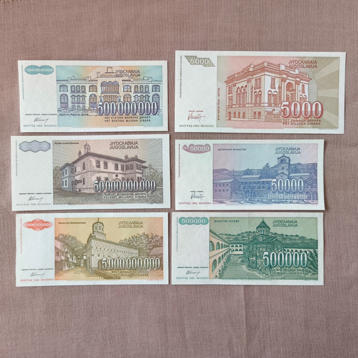 ست شش برگی دینار یوگسلاوی سری 1993 و بعد از اصلاحات اولیه ارزی. اسکناس ها همگی بانکی هستند به جز رقم 50هزار که یکی دو جا موج داره پس درحد بانکی در نظر بگیرید.