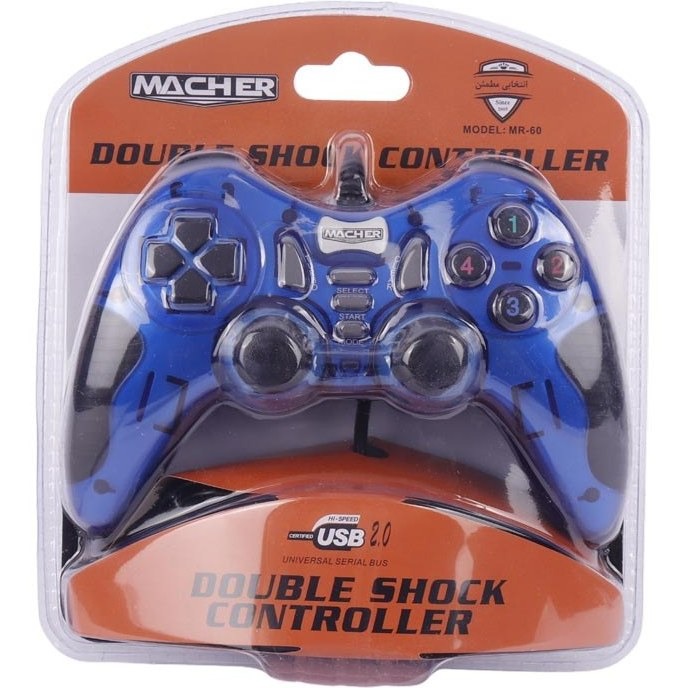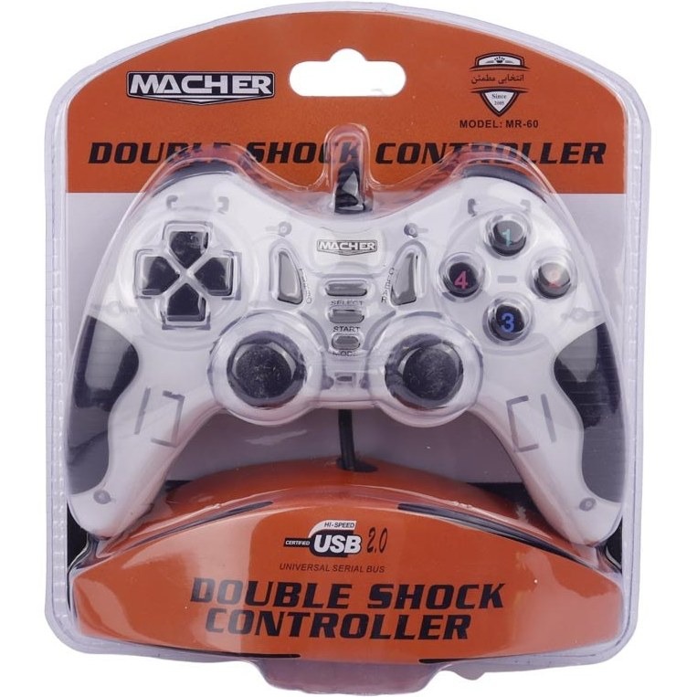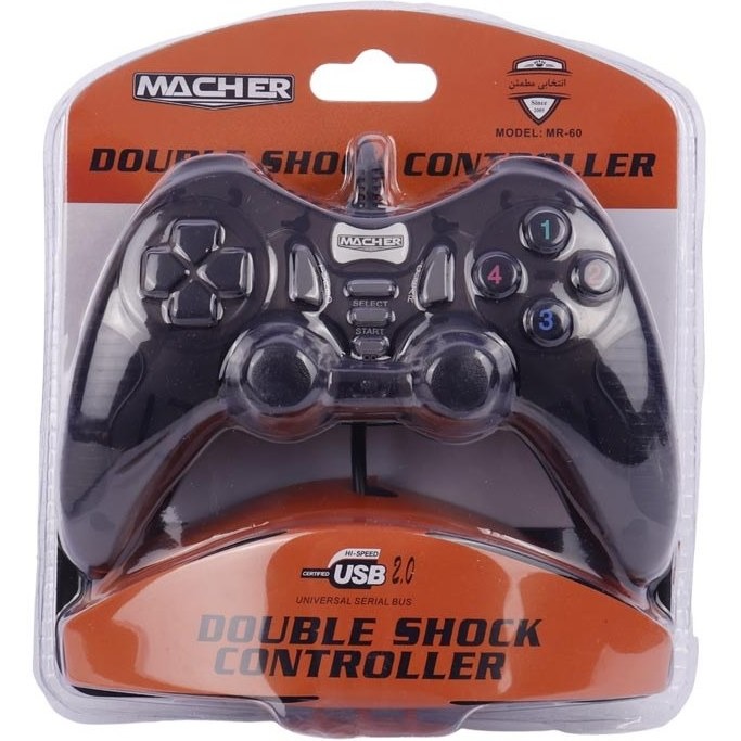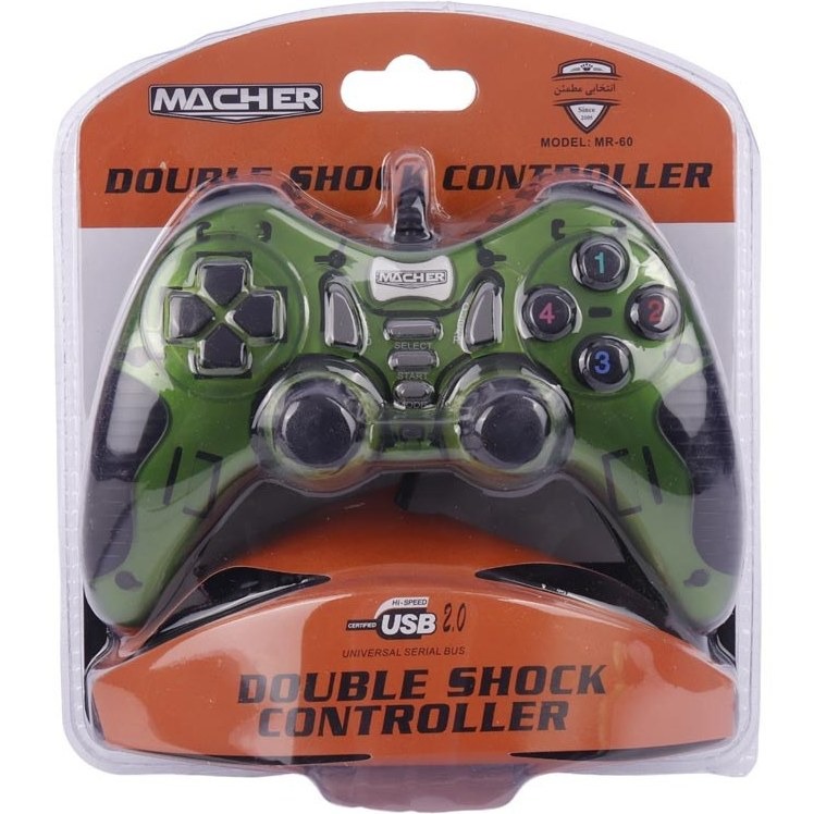 دسته بازی کامپیوتر تک حرفه ای Macher مدل MR-60 با طراحی فانتزی در رنگ بندی مشکی، قرمز، سبز، آبی، سفید مناسب برای بازی های رایانه ای، مخصوص گیمرهای حرفه ای و علاقمندان و اشخاصی که حرفه ای بازی های رایانه ای را دنبال میکنند است. نوع اتصال این دسته بازی کامپیوتر تک حرفه ای Macher مدل MR-59 سیمی بوده و از طریق درگاه USB کامپیوتر یا لپ تاپ متصل و با طراحی ارگونومی و ساختار مهندسی ساخته شده از نوعی پلاستیک مرغوب و ترکیب با چرم های مهندسی که علاوه بر شکیل شدن آن متناسب قسمت های در تماس با دست می باشد که از تعریق و لیز خوردن آن در صورت استفاده طولانی جلوگیری میکند. وجود 20 دکمه شامل چهار کلید اصلی بعلاوه 4 کلید جهت دار و چهار دکمه کمکی در شانه های و با دو کنترلر آنالوگ 360 درجه) همچنین 6 کلید کمکی شامل ( Turbo، Clear،Start ، Select ، Mode) در قسمت جلو بر روی گیم پد قرار داده شده است و برای کمک به بازی کننده برای متوقف کردن و فعال و یا غیرفعال کردن شک دسته به بکار رفته است.